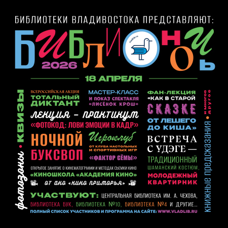 18 апреля муниципальные библиотеки Владивостока приглашают на ежегодную акцию «Библионочь – 2026». Это событие объединит любителей книг, творчества и новых ...