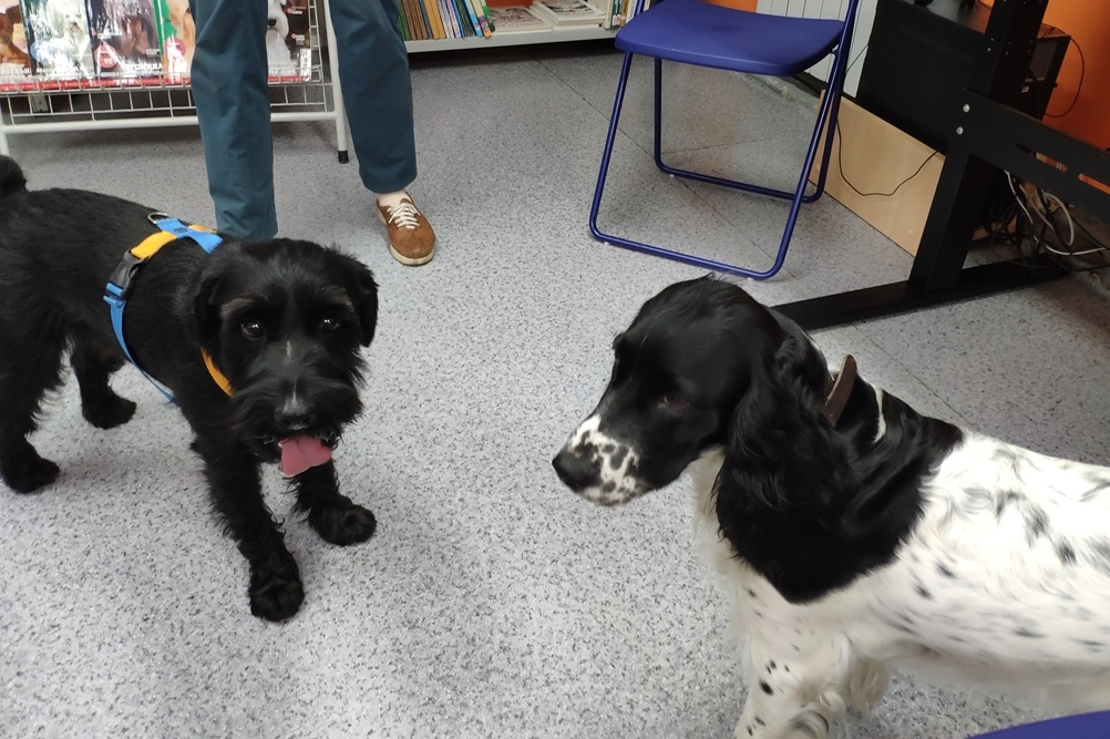 Екатерина традиционно была не одна. На встречу с волонтерами – поисковиками пришел ее напарник Вольт, трехлетний пес породы миттельшнауцер, который с удовольствием продемонстрировал навыки поиска любимой игрушки. Задача усложнялась тем, что кинолог намеренно запутала следы, прежде чем спрятать предмет. Вольт справился с задачей на «отлично»! Стоит отметить, что в библиотеке, помимо Вольта, была ещё одна собака. Это потенциальный кандидат в поисковики, семилетняя Мира породы русский спаниель. Мира – контактная, неконфликтная собака, на протяжении всей беседы мирно дремавшая у ног хозяина, в конце мероприятия с удовольствием составила компанию Вольту в игре. В ближайшие выходные состоятся первые пробные занятия волонтеров и их собак с Екатериной и Вольтом.