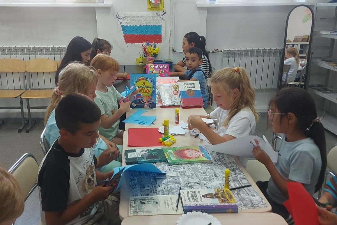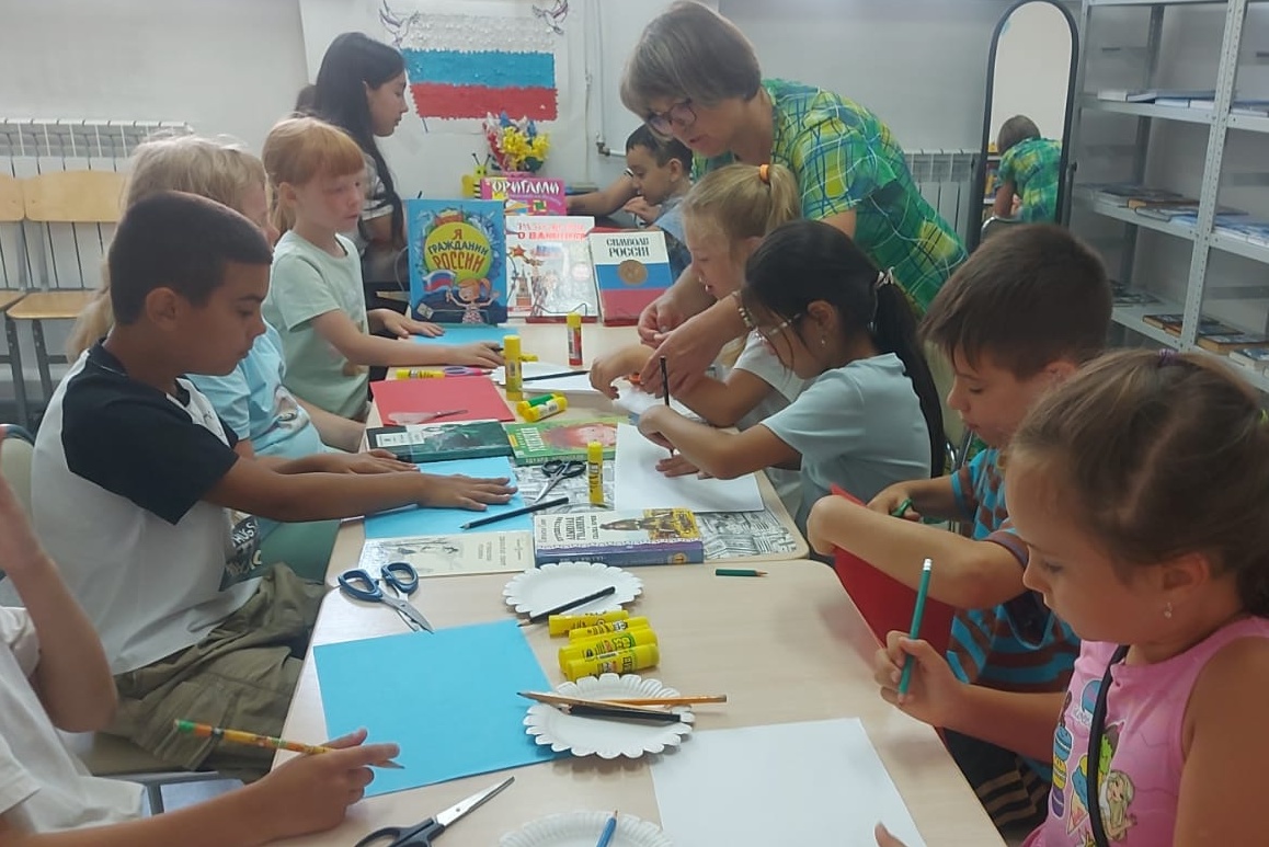 21 августа в библиотеке № 2 провели мероприятие для ребят из детского лагеря «Яркие ладошки». Участники мастер–класса изготовили аппликацию из бумаги в цветовой гамме величественного флага России — бело–сине–красных тонах. Во время занятия библиотекарь рассказал детям историю происхождения флага, что обозначает каждый цвет и то, что флаг является одним из важнейших атрибутов государства. В дружеской атмосфере ребята вырезали из бумаги детские ладошки и наклеивали на бумагу. В результате получился голубь мира в виде российского флага. А перышками ему послужили вырезанные из бумаги детские ладошки. Работа получилась очень необычная и все остались довольны результатом!