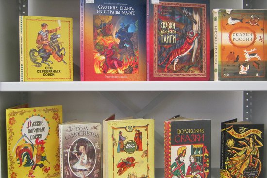 На выставке представлена подборка иллюстрированных сказок с разных регионов и республик России, и сделан акцент на сказках народов Дальнего Востока.