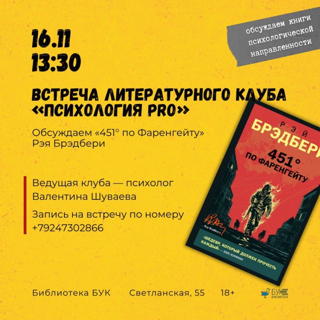 Ноябрьская встреча посвящена культовой антиутопии Рэя Брэдбери «451 по Фаренгейту». Вместе с ведущей — психологом Валентиной Шуваевой участники обсуждения получат возможность выйти за рамки простого пересказа сюжета и вместе исследовать, как это произведение, написанное десятилетия назад, оказывается точным портретом нашей современности.