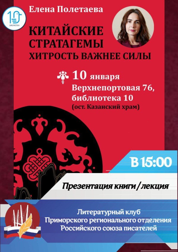 Литературный клуб Приморского регионального отделения Российского союза писателей приглашает на творческую встречу с Еленой Полетаевой — автором иллюстрированного издания «Китайские стратагемы», созданного по мотивам древнекитайского трактата «36 стратагем».