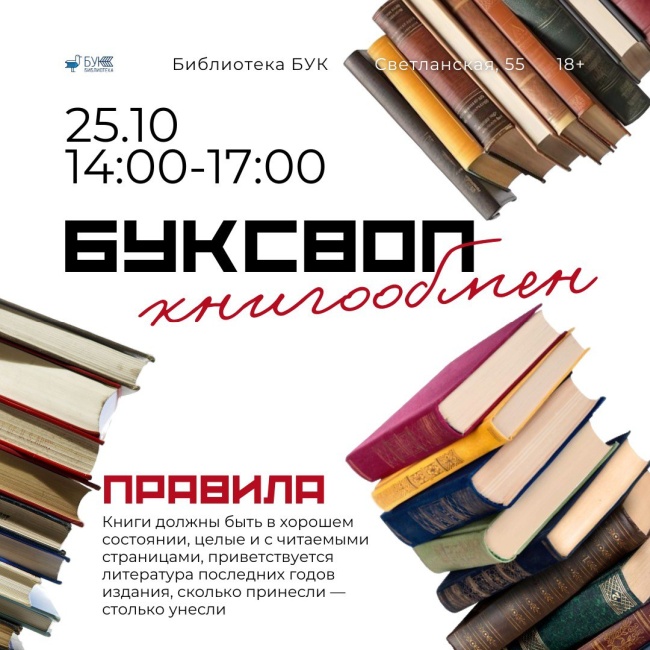 Книгообмен подразумевает обмен изданиями в равном количестве: принесите с собой одну или несколько книг, которые вы уже прочитали и готовы передать дальше, и заберите взамен что-то новое — возможно, именно ту самую книгу, которую вы давно искали или даже не подозревали, что она вам так нужна. Рекомендуем меняться литературой последних лет издания.
