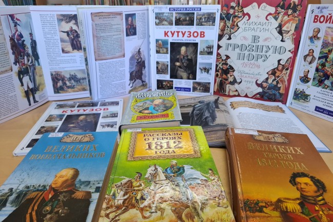 На выставке представлены произведения о полководце Кутузове, его воспоминания, литература, рассказывающая о его жизни.