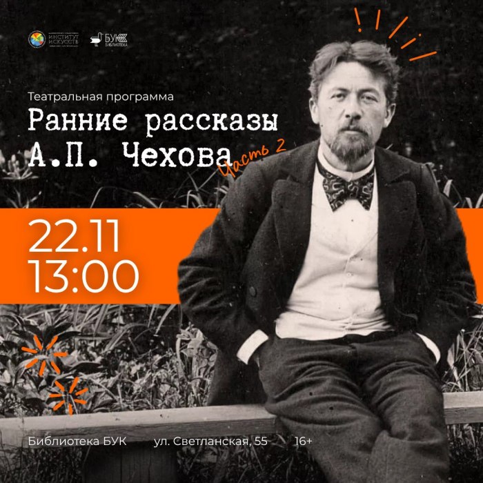 В библиотеке им. А.С. Пушкина состоится настоящий литературно-театральный разговор, посвященный 165-летию со дня рождения Антона Павловича Чехова. Студенты театрального факультета Института искусств оживят для читателей ранние рассказы Чехова – те самые, полные тонкого юмора, грусти и неподдельной человеческой правды.