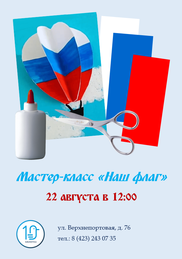 Библиотека приглашает детей в возрасте от 7 до 10 лет на познавательный час и мастер-класс, где они познакомятся с историей возникновения праздника – Дня Государственного флага Российской Федерации, узнают трактовку символических значений его цветов, отгадают загадки и проверят свои познания в викторине.
