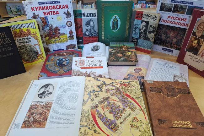 Книжная выставка представляет художественные и научно-популярные книги, в которых увековечена память об этих событиях и о личности полководца: Лошиц Ю. М. «Дмитрий Донской», Крутогоров Ю. А. «Куликовская битва», Балашов Д. М. «Святая Русь». В данных произведениях особое внимание уделяется Куликовской битве, различным аспектам сражения и его историческим оценкам.