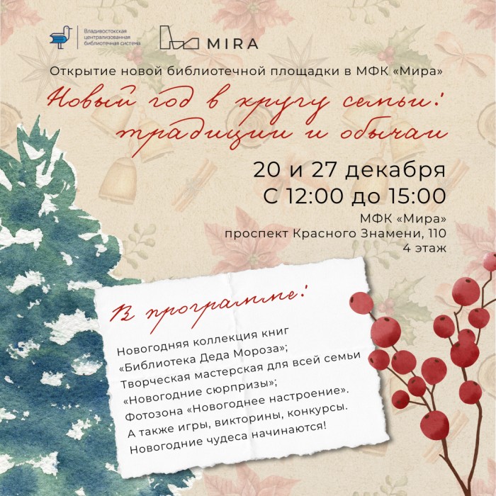 В МФК «Мира» открывается новая библиотечная площадка «Мирабела». Специалисты библиотечной системы Владивостока предлагают посетителям комплекса литературно-творческую, праздничную программу «Новый год в кругу семьи: традиции и обычаи».