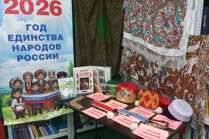 Экспозиция с элементами одежды, быта, фотографиями, организованная сотрудниками библиотеки — отличный способ познакомиться с культурой народов России.