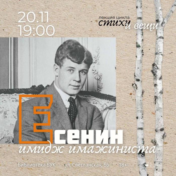 В библиотеке «БУК» состоится лекция из цикла «Стихи и вещи». На лекции слушатели совершат увлекательное путешествие в эпоху формирования и развития стиля поэта Сергея Есенина, узнают, как мода влияла на его творчество и самовыражение.