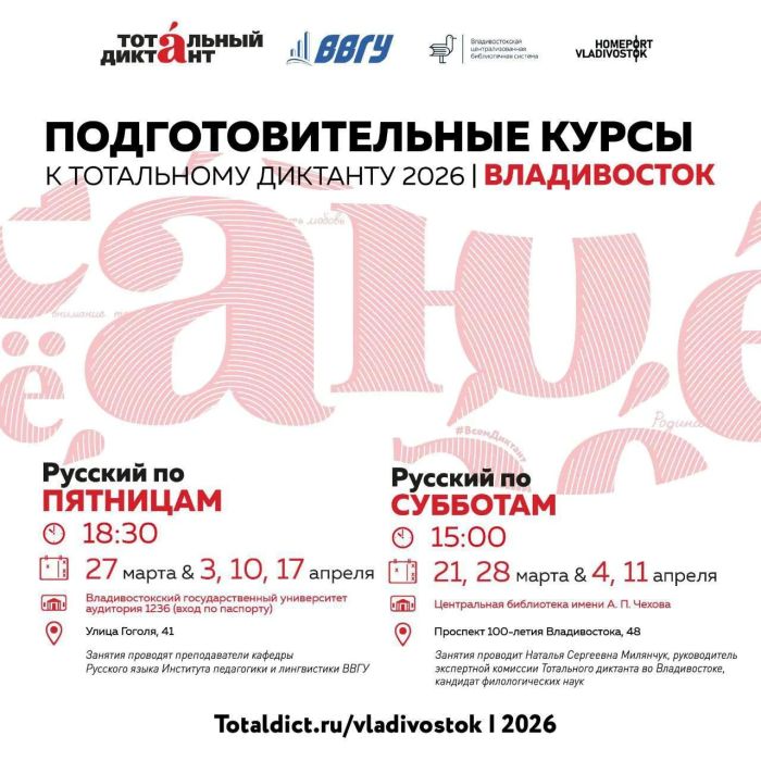 - В Центральной библиотеке им. А. Чехова (проспект 100-летия Владивостока, 48) по субботам: 21, 28 марта и 4, 11 апреля. Начало: в 15.00.