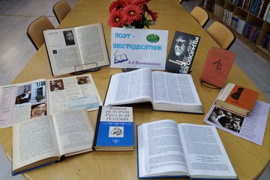 В библиотеке №12 открыта выставка «Поэт — шестидесятник» Выставка посвящена 90-летию Андрея Вознесенского.