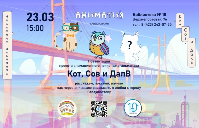 В библиотеке мультстудия «АНИМАГИЯ» презентует свой проект — челлендж-альманах «Кот, Сов и Далв», который создается для всех, кто любит Владивосток. Главный герой проекта – сам город. То, как он меняется, как развивается, что в нем видят те творцы-аниматоры, которым он дорог и любим.