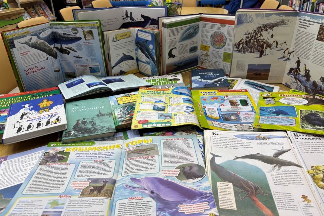 Посетители библиотеки могут совершить увлекательное путешествие по морским глубинам. На выставке представлены книги и журналы, которые расскажут, как киты поют свои песни и общаются на расстоянии тысячи километров, почему дельфины такие умные и зачем они играют в волны, как люди могут защитить этих удивительных животных.