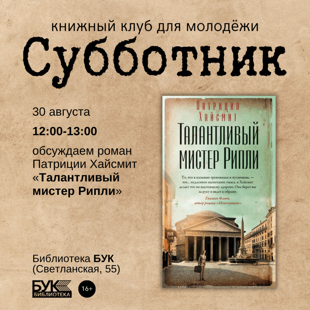 Неважно, читали ли вы книгу ранее или только начали знакомиться с ней — приходите за живым общением, интересными мыслями и новыми открытиями. Читательский клуб «Субботник» проходит каждую последнюю субботу месяца.