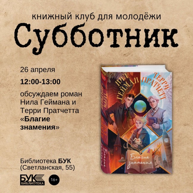 На очередной встрече состоится обсуждение романа «Благие знамения» Нила Геймана и Терри Пратчетта.