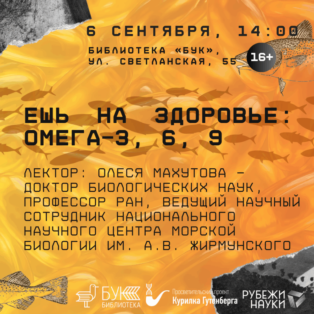 Научно-просветительский проект «Курилка Гутенберга» во Владивостоке! В субботу в библиотеке состоится лекция «Ешь на здоровье: омега−3, 6, 9», на которой посетители узнают, что такое жирные кислоты, и какую роль они играют в нашем организме.