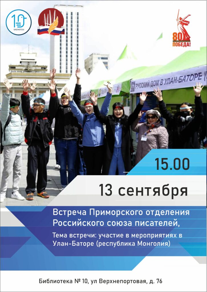 Поэты и писатели поделятся яркими впечатлениями от поездки в Монголию на Все-монгольскую книжную ярмарку, которая проходила в Улан- Баторе. Делегация полноценно присоединилась к международным акциям — «Библионочь», «Победный май», организованных Русским Домом в Монголии.