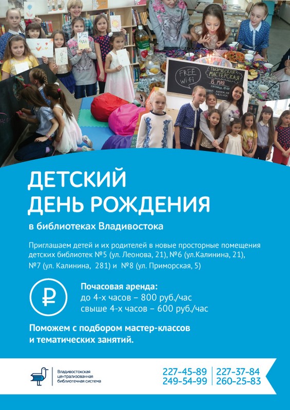 Библиотеки Владивостока приглашают организовать детский день рождения в библиотеке Библиотеки предлагают просторные современные помещения и помощь родителям в подготовке к лучшему празднику детства – Дню рождения
