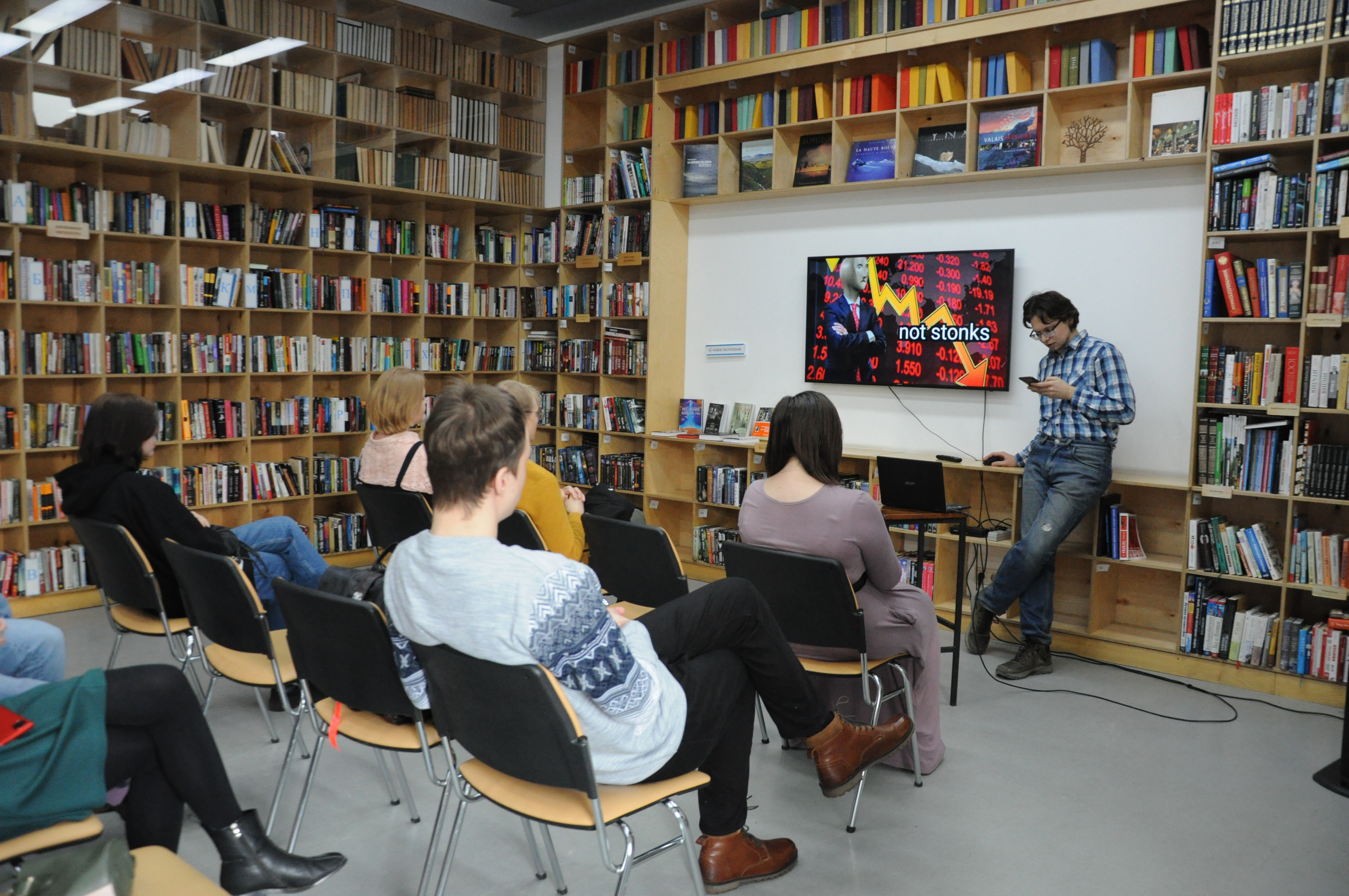 На февральском мероприятии в библиотеке «БУК» были представлены несколько презентаций: о методах и правилах создания выразительных открыток, об искусстве автопортрета на примере произведений известных художников, о таких профессиях, как метеоролог и комьюнити-менеджер, а также о противостоянии компаний, создающих реслинг-шоу.