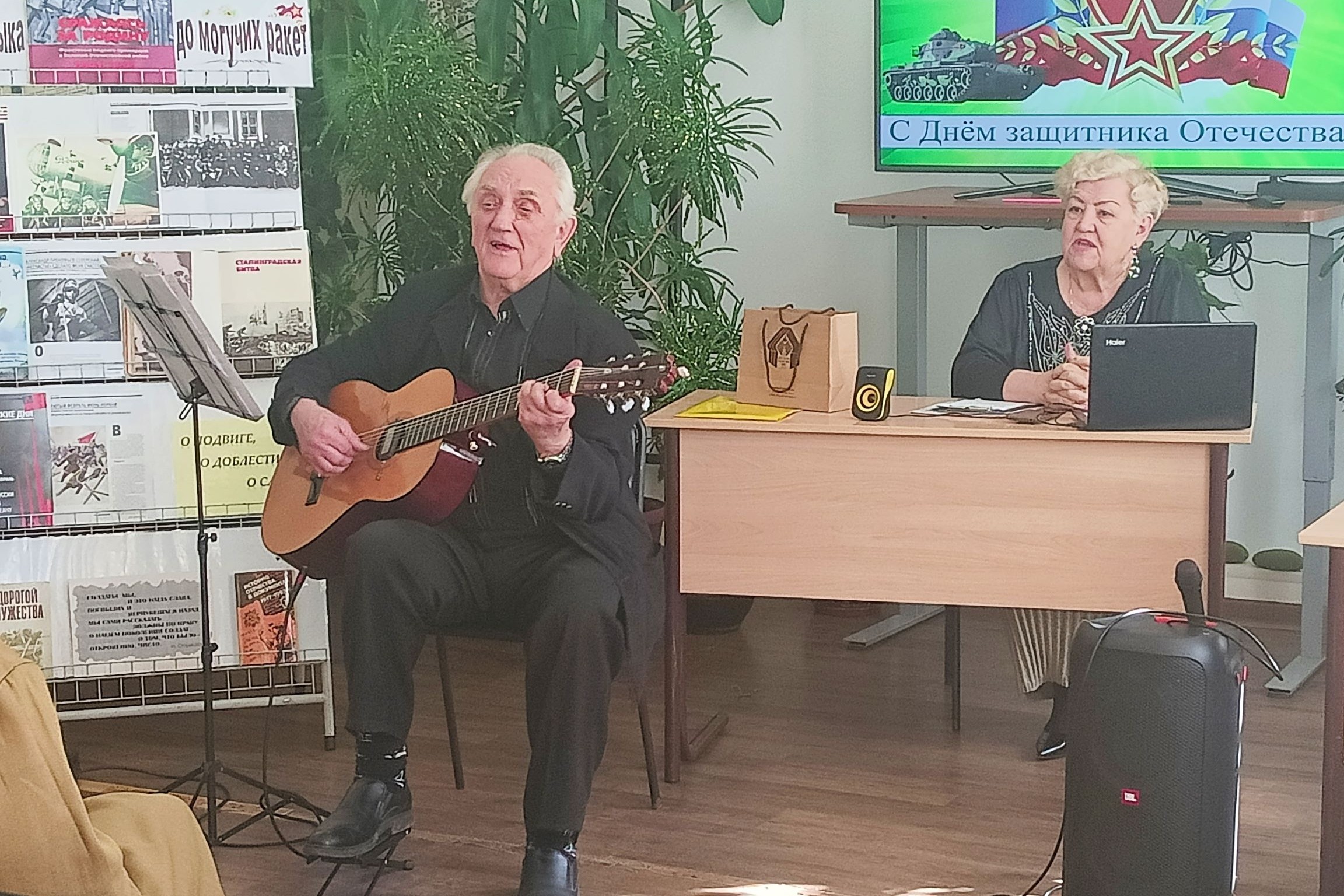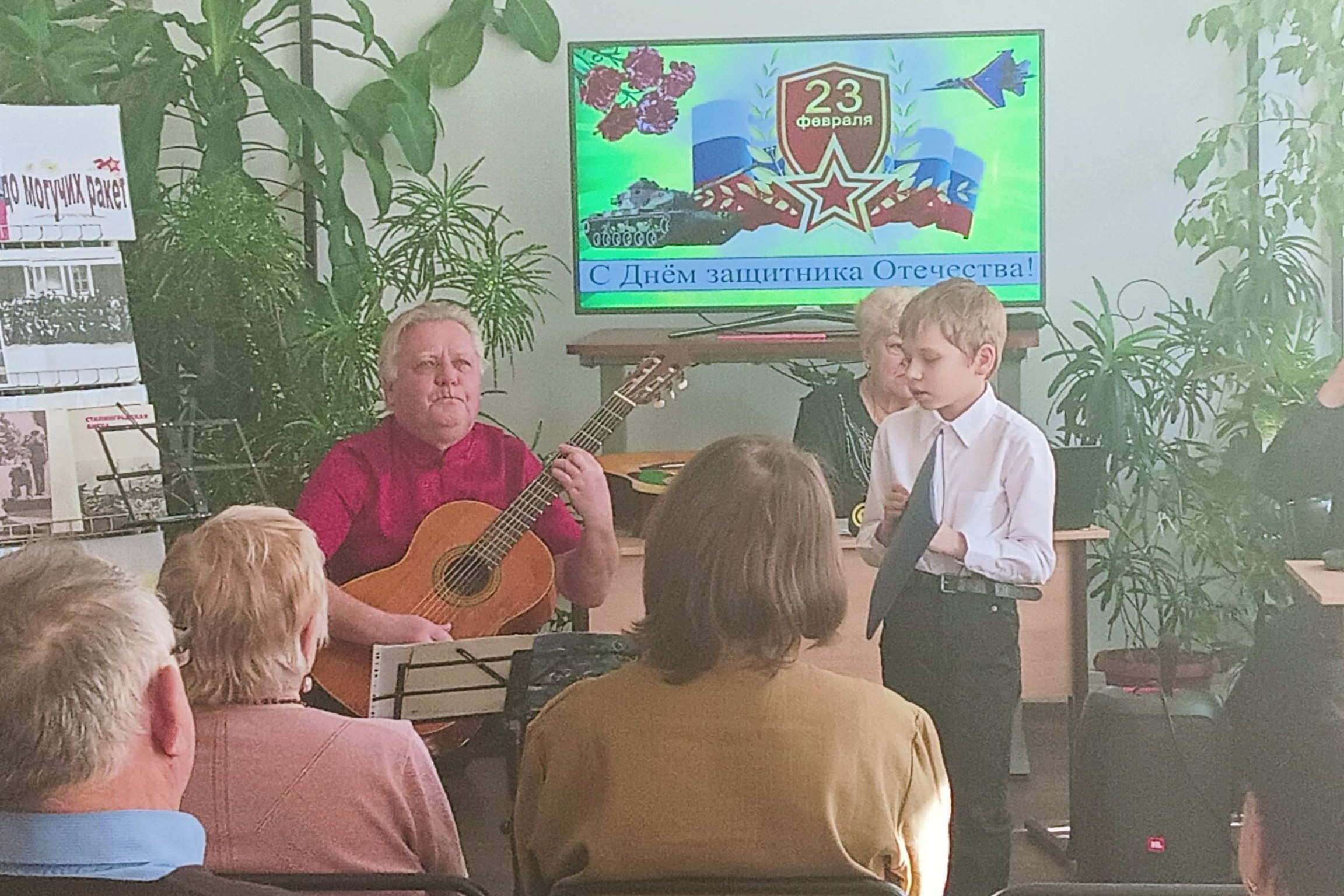 22 февраля в библиотеке им. И.У. Басаргина состоялась литературно-музыкальная композиция «Слово во славу защитников». Праздничный концерт открыл Владимир Владимирович Мороз военно-патриотическими песнями «Нам нужна одна победа», «Бери шинель», «В лесу прифронтовом». Знакомые с детства песни подхватывает весь зал. На этой волне свои поздравления начинает вокальная группа «Русская песня» (руководитель А.В. Яковенко). Мужчин поздравляют стихами собственного сочинения на мелодии популярных русских песен, завершая выступление словами: «Сто футов под килем вашему песенному кораблю».