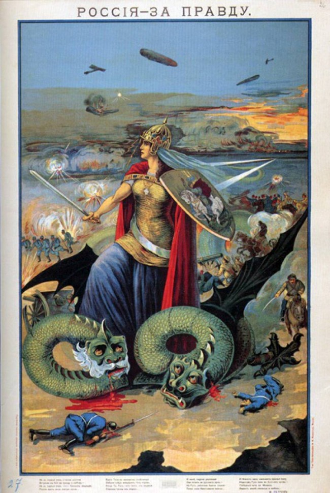 Обложка: Плакат 1914 года. Российская империя изображена в образе поленицы, попирающей змея с двумя головами, символизирующими Германию и Австро-Венгрию.