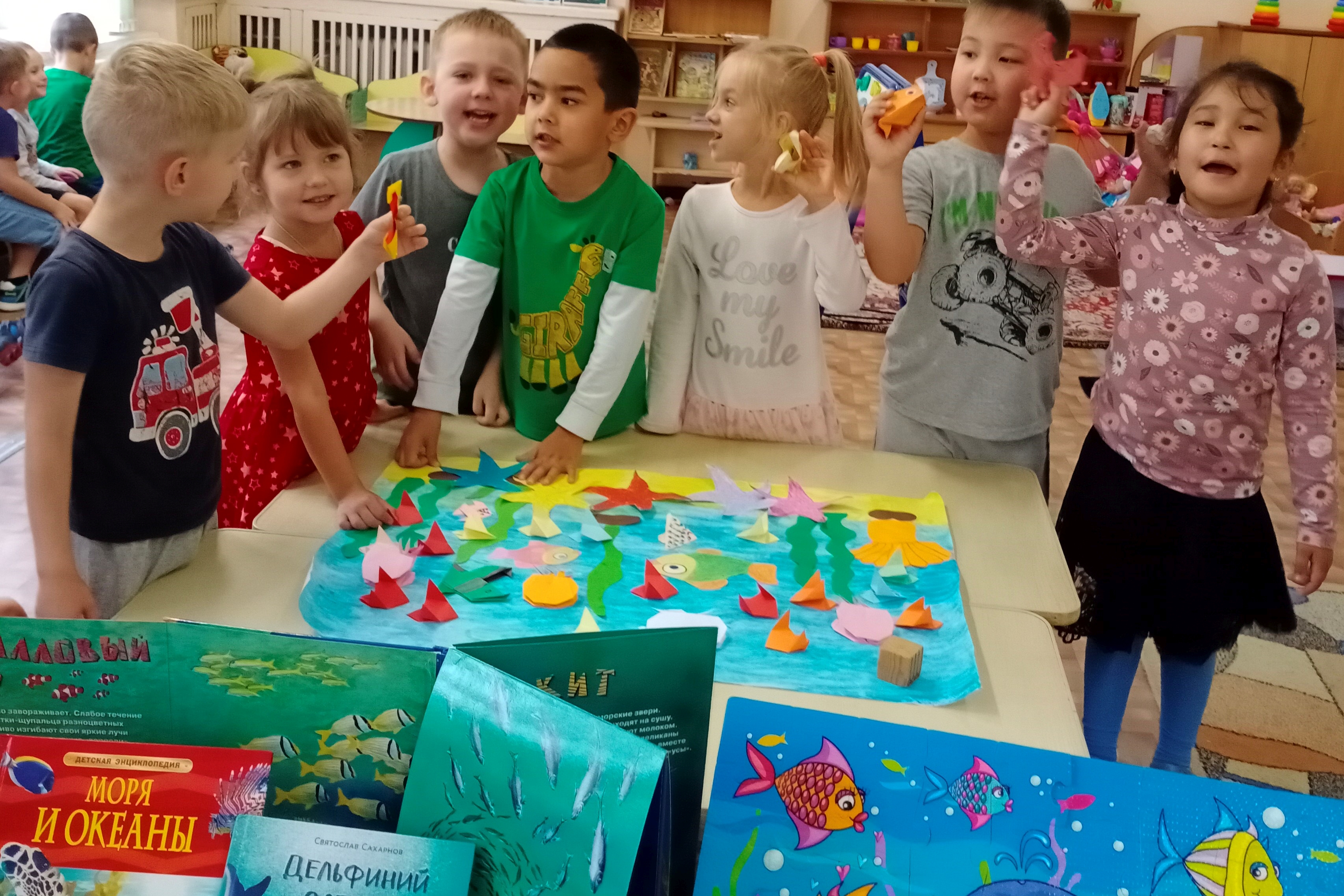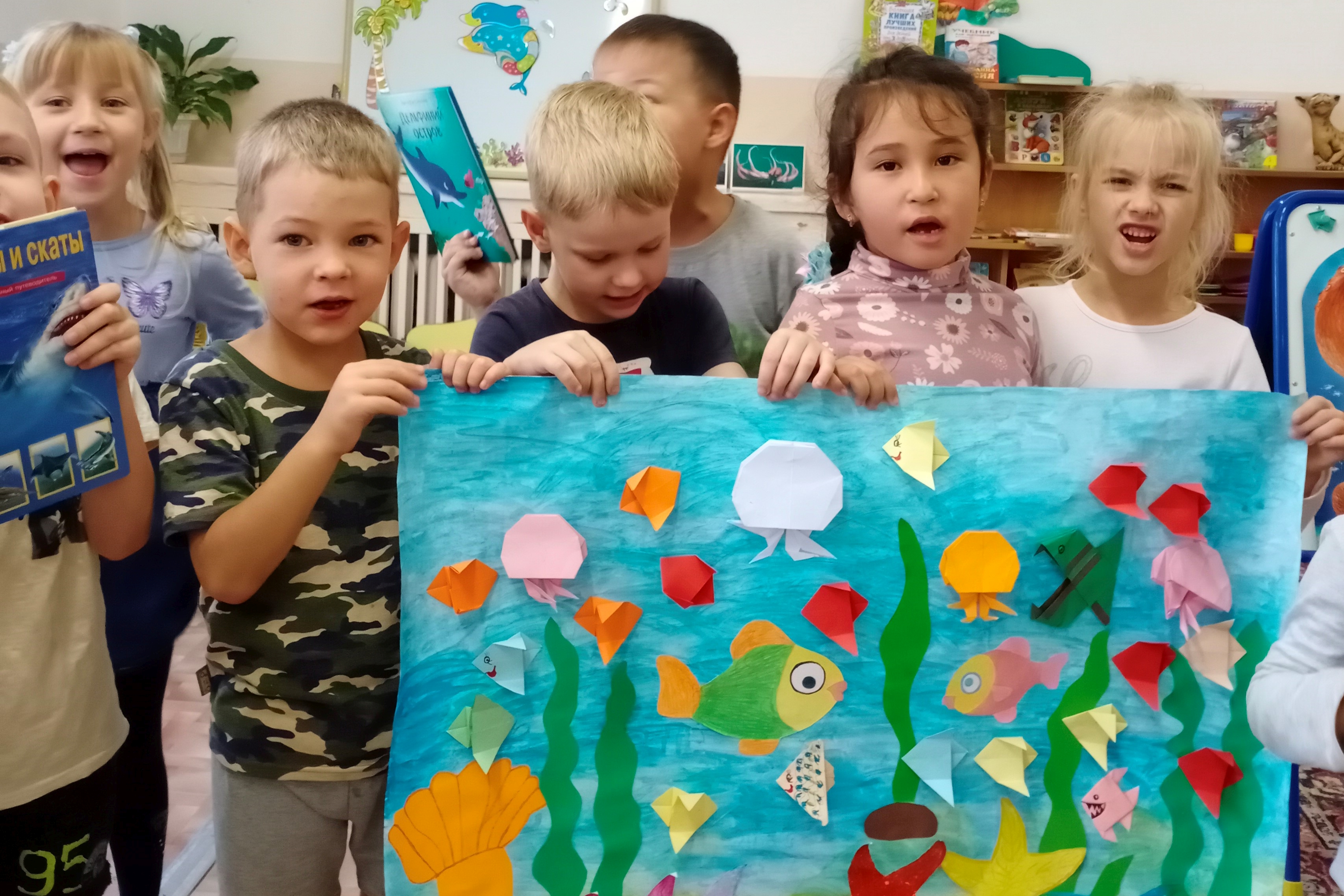 Дети старшей группы «Звёздочки» детского сада № 117 стали участниками познавательно-творческого мероприятия «Обитатели моря», совершив необычный экскурс в мир обитателей моря с удивительно красивыми, необычными и познавательными книгами библиотеки № 9. В дополнение к информации дети отлично разгадывали морские загадки, разгадали по картинке необычных рыб с помощью предметов-«тёзок»: игла, пила, ёж, молот, луна. Проявили свои творческие способности, вместе создали целую панораму морских обитателей, сделав из бумажных заготовок, созданных библиотекой морскую картину жизни разных обитателей: морских звёзд, рыб, медуз, актиний. Получился удивительно яркий, нестандартный шедевр, который занял достойное место на стене, чтобы все родители смогли увидеть творение, созданное фантазией и трудом детей.