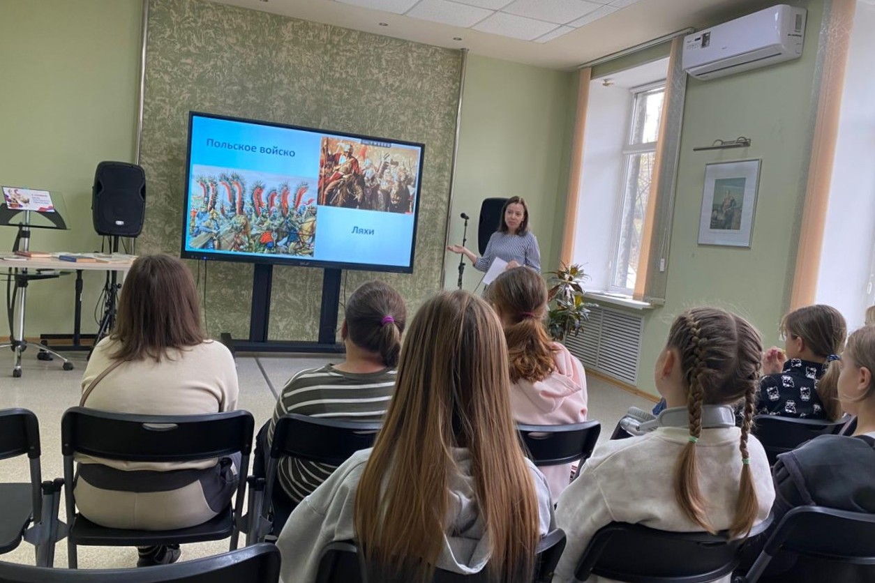 28 октября познавательное путешествие в прошлое «Под стягом Минина и Пожарского» состоялось в библиотеке им. Н.Н. Муравьева-Амурского (ул. Калинина, 21). Школьники из СОШ № 62 услышали о событиях 1612 года, познакомились с Кузьмой Мининым, Дмитрием Пожарским и Иваном Сусаниным. Мысленно перенеслись в начало 17 века, увидели Смутное время, нашествие поляков, приход на царство Михаила Романова. Ребята узнали о том, что не только в Смутное время русский народ объединялся, чтобы защитить свою страну. Было еще вторжение Наполеона и Великая Отечественная война, когда выстоять нашей стране тоже помогло всеобщее единство и готовность каждого человека пожертвовать собой ради Родины. Школьники с интересом прослушали отрывок из стихотворения Кондратия Рылеева «Иван Сусанин» и отрывок из рассказа Станислава Романовского «Суета».