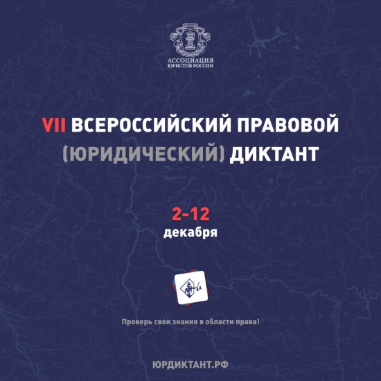 С 2 по 12 декабря 2023 года в онлайн-режиме пройдет VII Всероссийский правовой (юридический) диктант. Принять участие в тестировании можно на сайте юрдиктант.рф. Диктант рассчитан на граждан в возрасте от 14 лет.