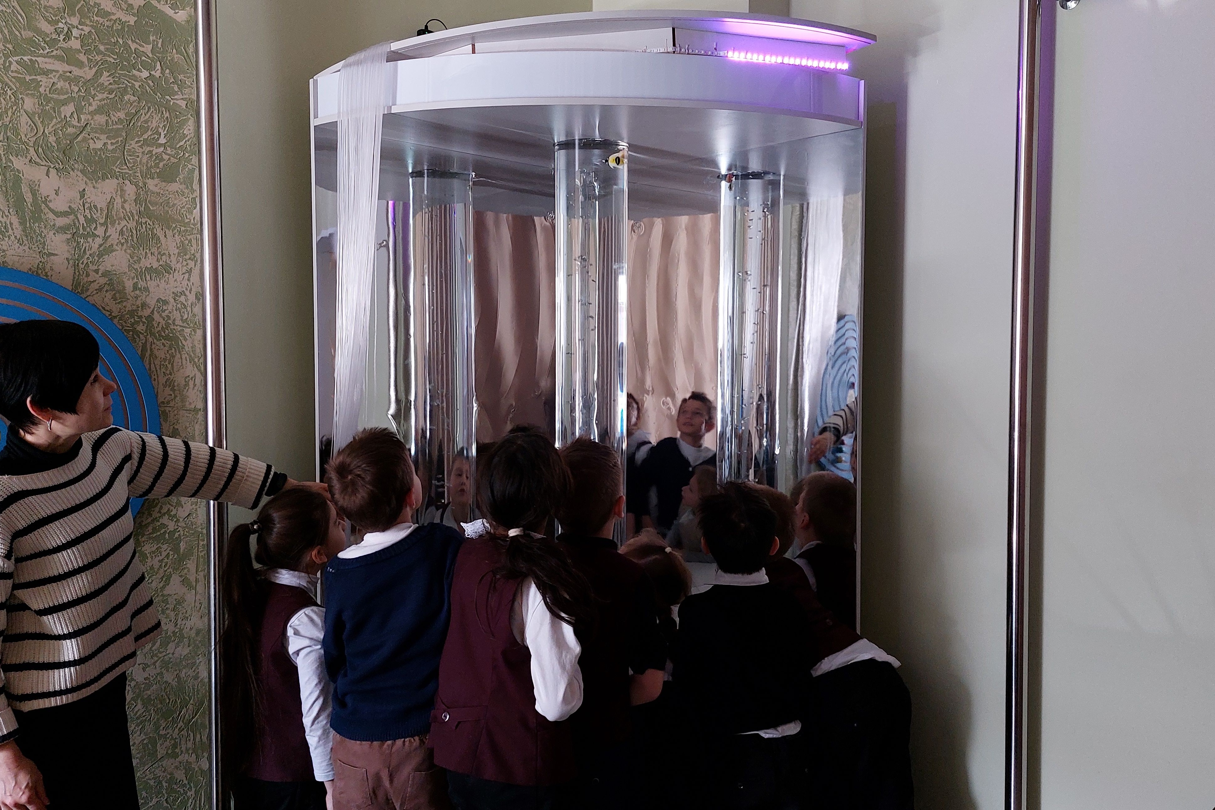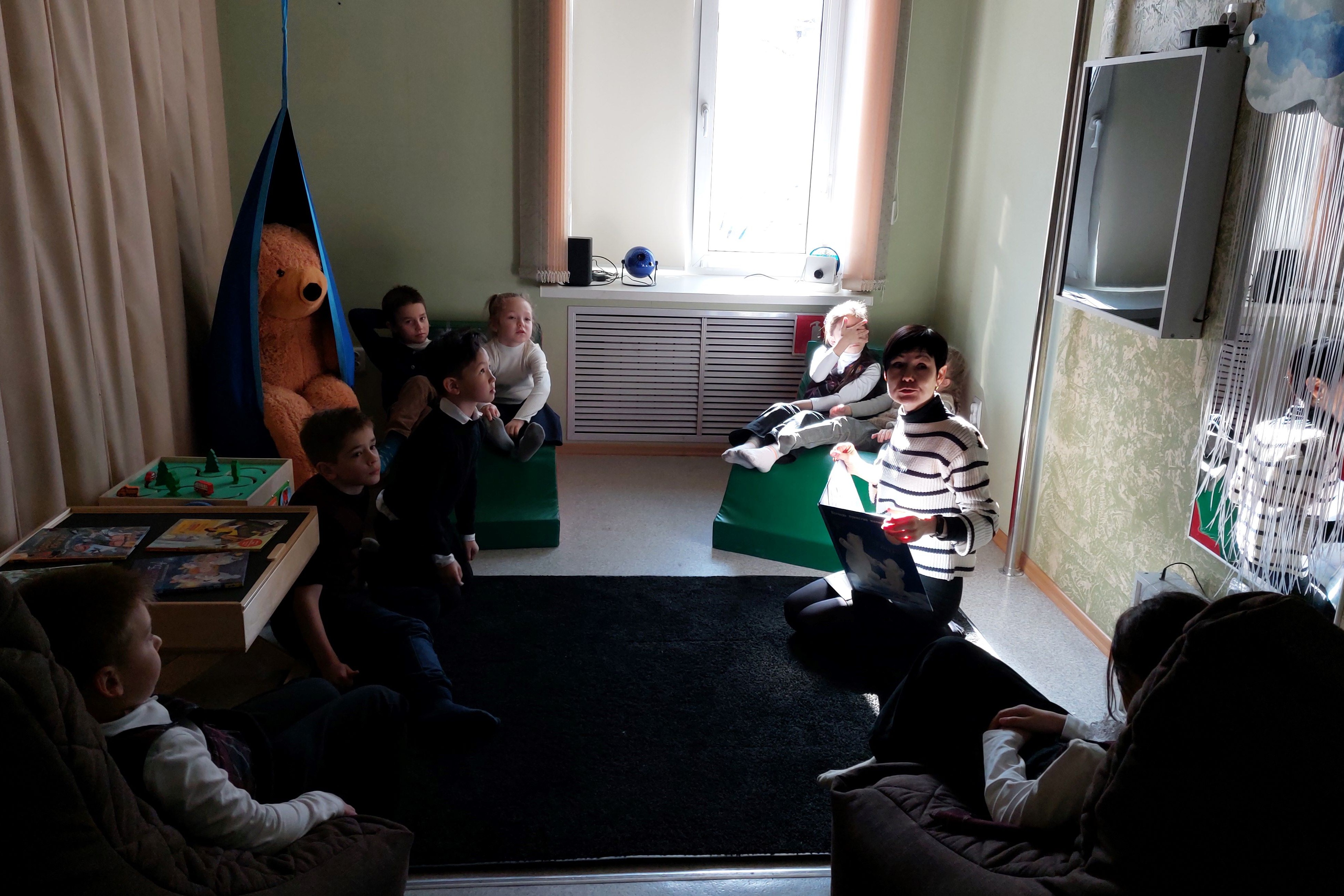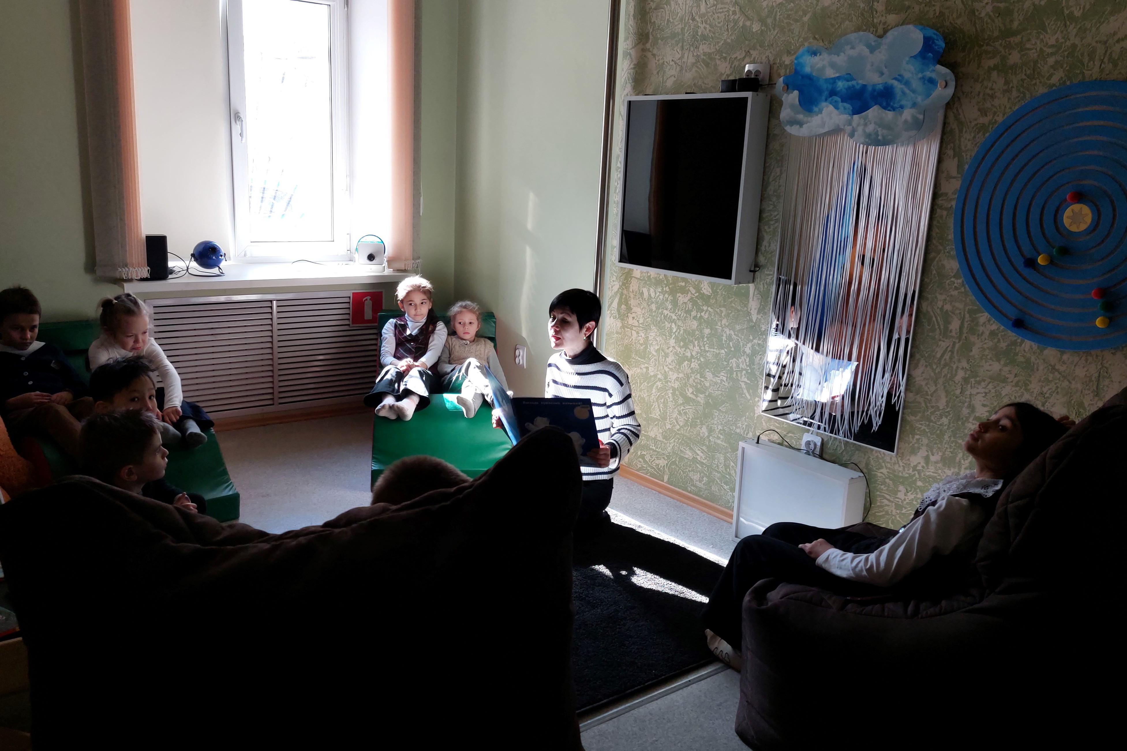 Еще одно пространство библиотеки – сенсорная комната «Оазис» – составляет конкуренцию интерактивным технологиям. Здесь в тишине, под звездным небом, в окружении светящихся объектов, удобно расположившись на мягких креслах и креслах-трансформерах или просто на ковре, можно послушать сказки, ответить на вопросы, поделиться своими впечатлениями, а можно просто посидеть в тишине.