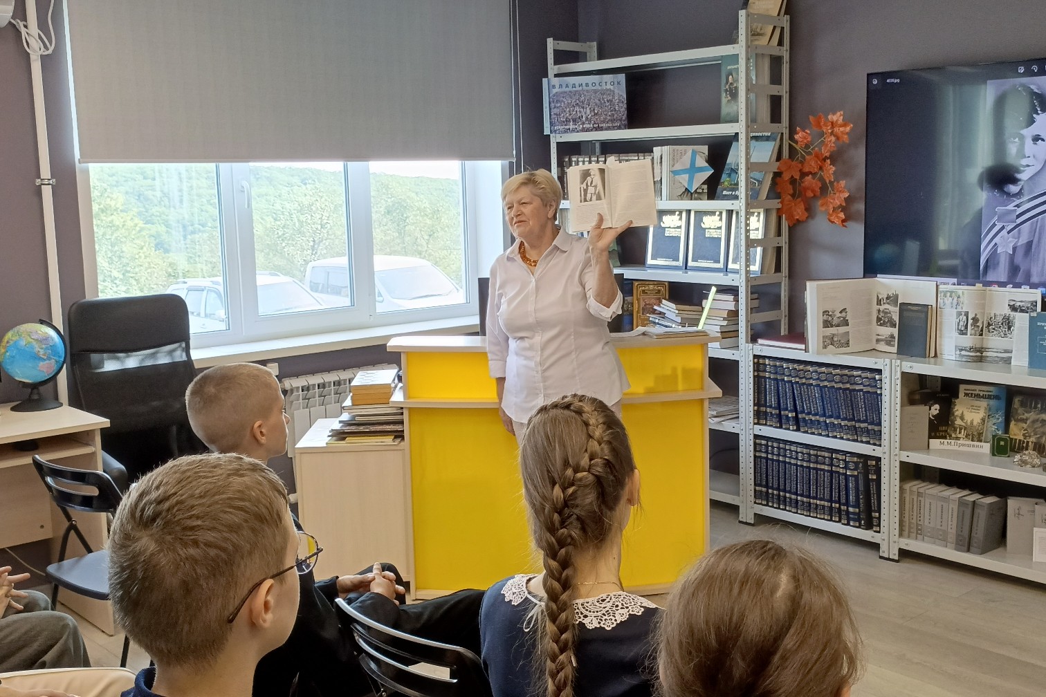 Учащиеся слушали очень внимательно рассказ и стихи о бесстрашной девушке, и воспоминания тех, кто ее знал. Память юной героини увековечены повсеместно – в местах ее проживания, школах, где она училась, в отряде, котором служила, где работала и на месте гибели, в Корее. Эти памятные места запечатлены в литературных источниках, которыми пользовалась библиотекарь, и были показаны присутствующим.