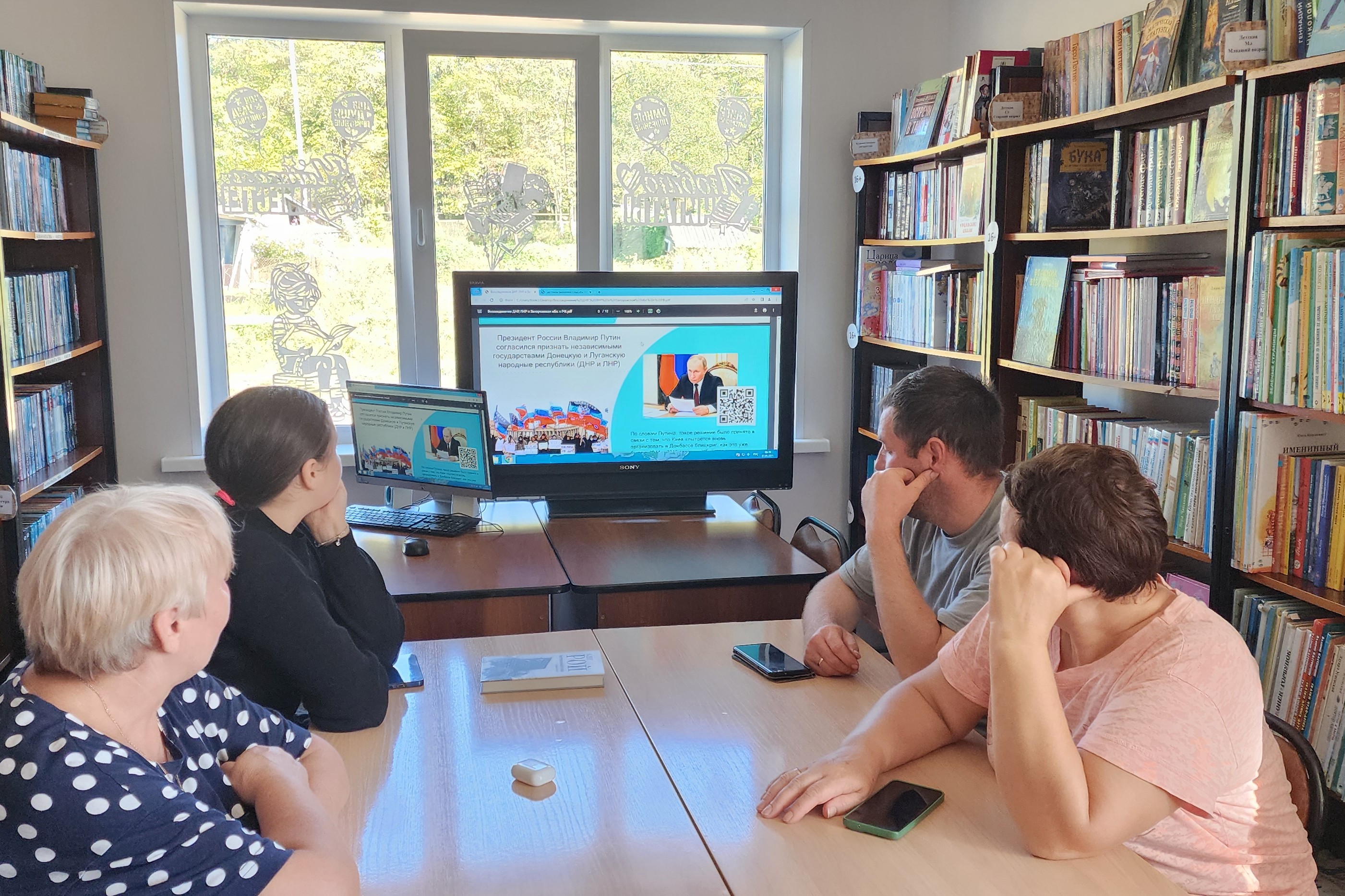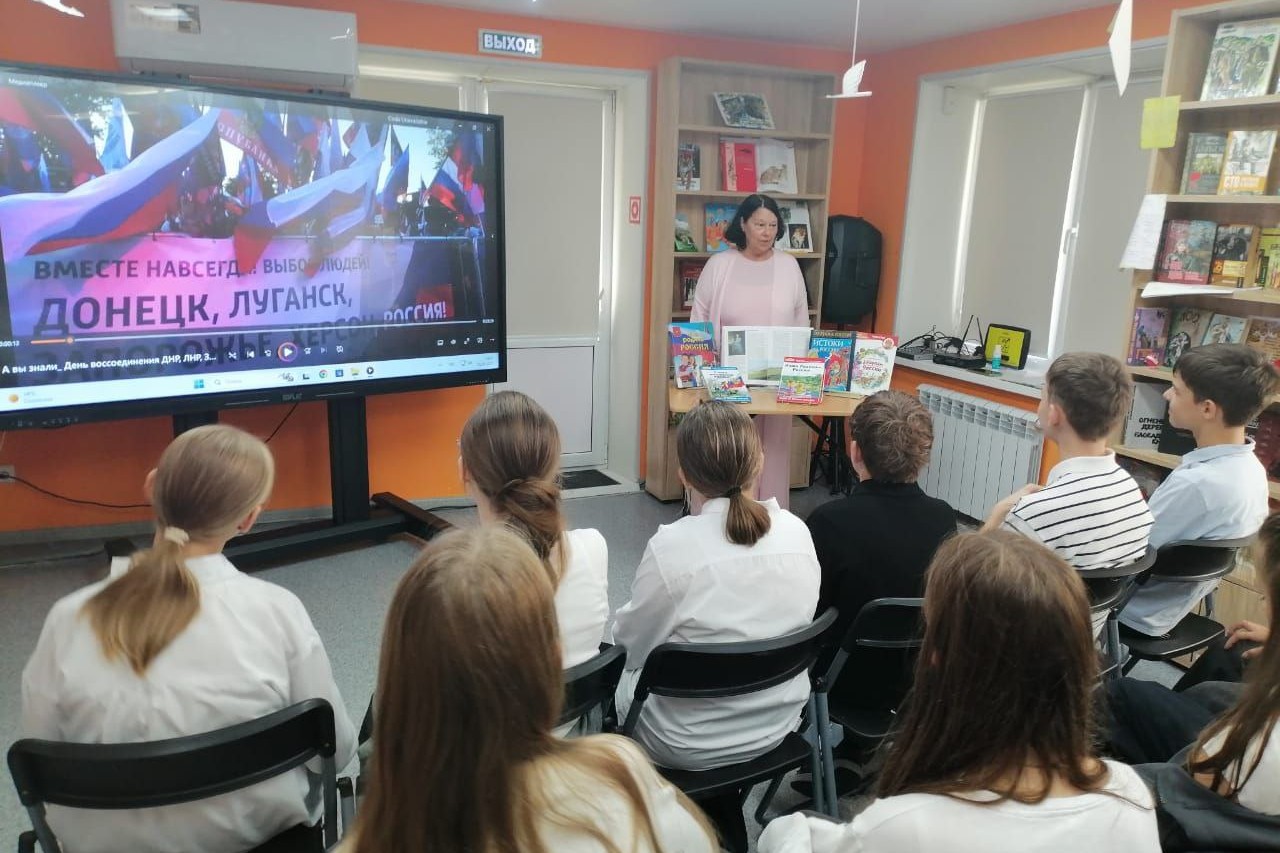 В библиотеке № 19 (с. Береговое) прошел тематический час «Возвращение домой: от единства духа к единству страны». Беседа началась с вопроса к аудитории: «Что для вас лично означает словосочетание «единство духа», особенно в свете недавних событий?». Участники высказались о чувстве общей исторической судьбы, о том, что мы «один народ», разделённый искусственными границами. Поднималась тема общей веры, культуры и языка. Упоминались некоторые истории знакомых с Донбасса, которые долгие годы ждали поддержки. Участники пришли к мнению о том, что воссоединение — это акт исторической справедливости, основанный на воле народа и подготовленный всей нашей общей историей.