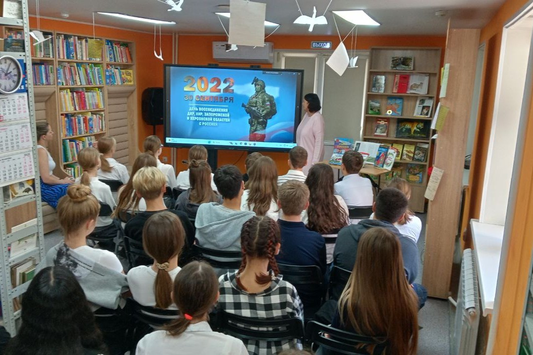 Библиотека №15 (ул. Волкова, 11) провела акцию «Навечно вместе». Участниками акции стали учащиеся 7 «а» класса ЦО «Вектор». Независимые республики — в составе России, но всполохи войны продолжаются. При абсолютной тишине, когда застыл даже воздух в классе, семиклассники читали стихи о Донбассе. «Укутайте Донбасс мой в тишину, Укройте мирным небом – словно пледом. Пусть отдохнет он, вопреки всем бедам, Пусть станет детский плач ему не ведом. Не возвращайте на Донбасс войну!!!» — проникновенное стихотворение, Донбассу написала Надежда Тамбаева, 7 апреля 2022г.