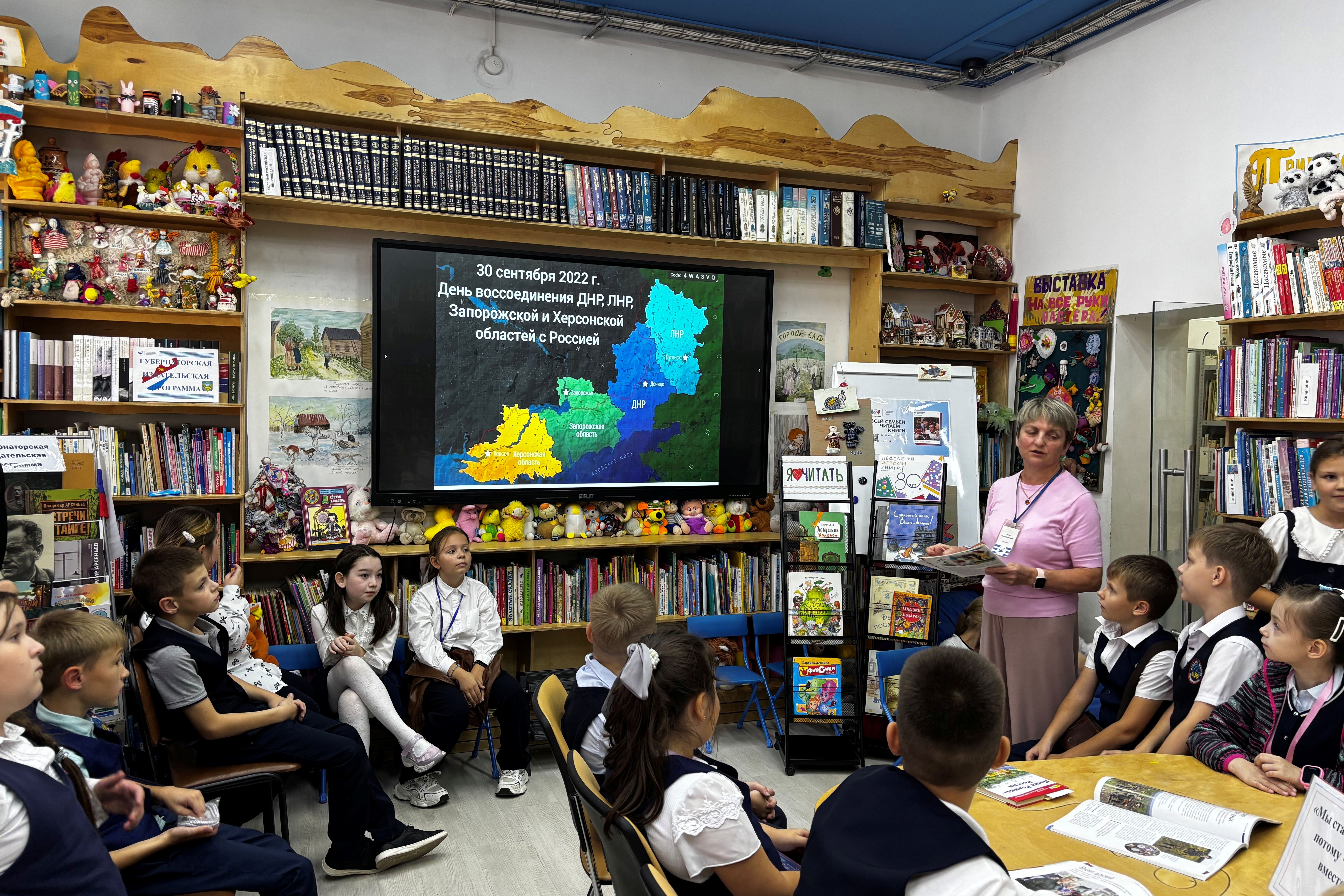 В детской библиотеке №7 (ул. Калинина, 281) ученики 3 «В» класса школы №74 участвовали в патриотическом часе «Мы – вместе». Мероприятие началось с разговора о том, что наша большая и прекрасная страна стала еще больше, а семья народов России – еще крепче. Библиотека пригласила ребят в увлекательное виртуальное путешествие по новым регионам. На большом экране оживали слайды презентации. Дети с восторгом рассматривали промышленные гиганты Донбасса и живописные степи Луганщины. Они увидели древние курганы и узнали про заповедный остров Хортица – колыбель запорожского казачества. Когда речь пошла о Херсонской области, многие вспомнили, что это край винограда, сладких арбузов и, конечно, моря. Увидели, что здесь находится знаменитый Аскания-Нова – уникальный заповедник, где живут животные со всего мира прямо в степи. Это небольшое путешествие стало для юных читателей ярким событием, которое оставило в их сердцах чувство сопричастности к великой истории своей страны.