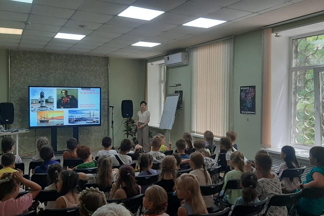 Краеведческий час «Отсюда и владеть Востоком!», посвященный 165-летию Владивостока состоялся в библиотеке им. Н.Н. Муравьева-Амурского (ул. Калинина, 21). Ребята из пришкольного лагеря СОШ № 62 познакомились с интересными фактами из истории города, совершили «прогулку» к достопримечательностям Владивостока и полюбовались символами краевого центра. Отдельная часть рассказа была посвящена основателям и первым поселенцам Владивостока, а также, графу Муравьеву-Амурскому, чье имя носит библиотека. Дети с азартом вспоминали названия «древесных» и «кустарниковых» улиц Первомайского района, обитателей Приморского океанариума, интересные достопримечательности Владивостока, присущие только нашему городу. Например, маяк на Токаревской кошке или городской транспорт – фуникулер.
