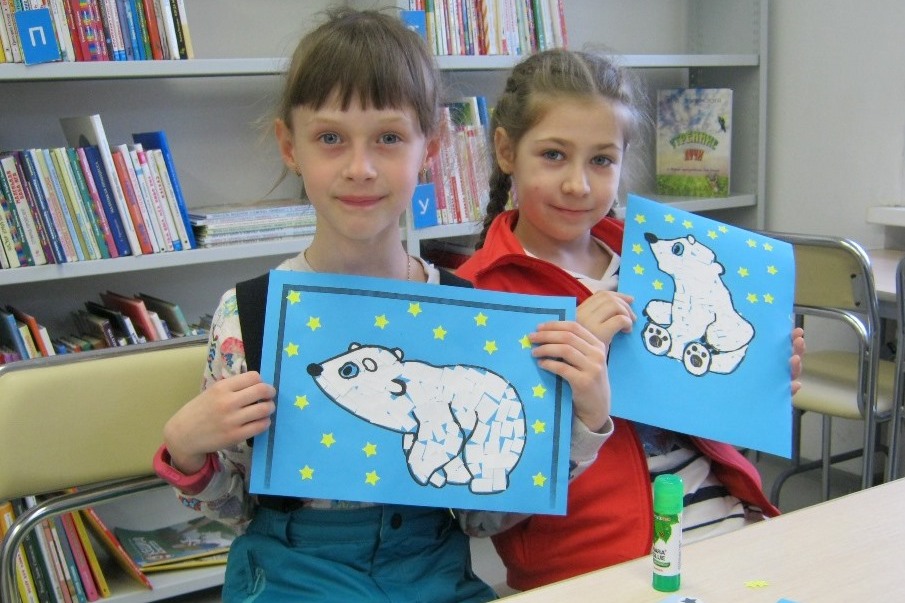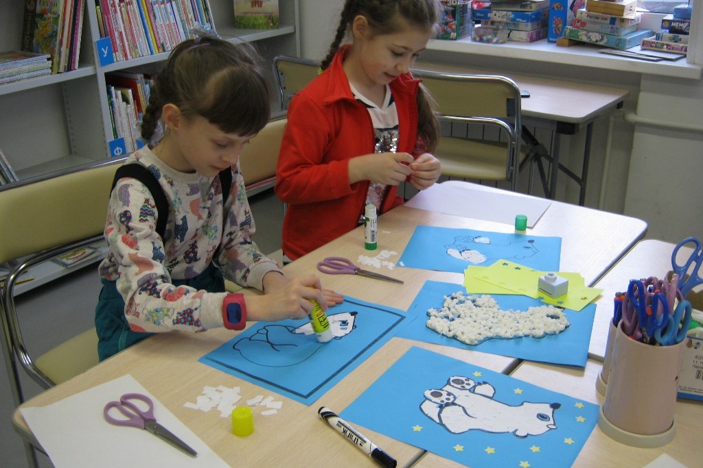 25 февраля на творческой мастерской отмечался Международный день полярного медведя. Девочки мастерили поделку и распевали за работой песни из мультфильма «Медвежонок Умка». Для аппликации можно было выбрать себе фигурку такого Умки, который больше понравится: сидящий, бредущий или ловит рыбку. И фактуру аппликации тоже можно было выбрать – просто фрагментами бумаги или комочками из салфеток.