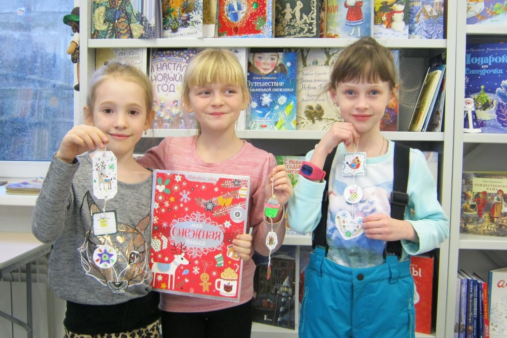 В библиотеке №8 продолжаются творческие мастерские, вдохновленные «Библиотекой Деда Мороза». Уже не первый год фаворитом детей в новогодней подборке становится альбом раскрасок «Моя снежная книга». Там есть рисунки и попроще и такие, над которыми надо просидеть не один час, кропотливо раскрашивая мелкие детали. Из таких вот раскрашенных рисунков девочки на творческой мастерской вырезали фигурки и нанизали на толстую нитку — получились декоративные праздничные подвески.