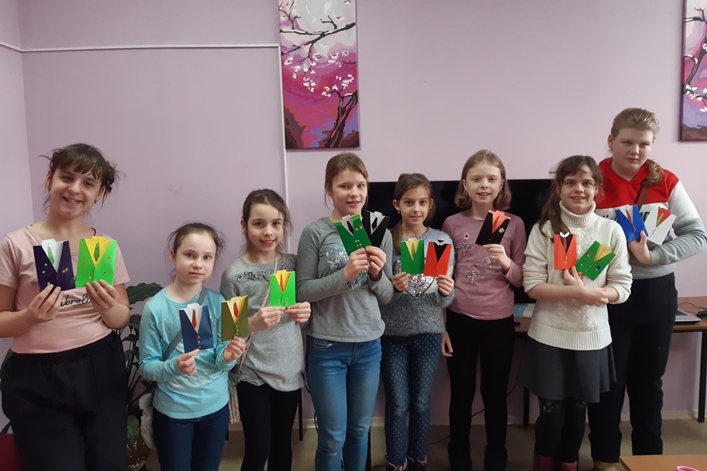 22 февраля в библиотеке №13 девочки мастерили праздничные открытки в виде мужского пиджака. Подобрали подходящую рубашку и галстук, и работа закипела. Несмотря на схожесть шаблонов, открытки-костюмы получились у всех разные, ведь фантазия юных мастериц подсказала какими еще декоративными элементами можно украсить свой подарок. Каждая девочка сама написала внутри открытки поздравление папе или дедушке.