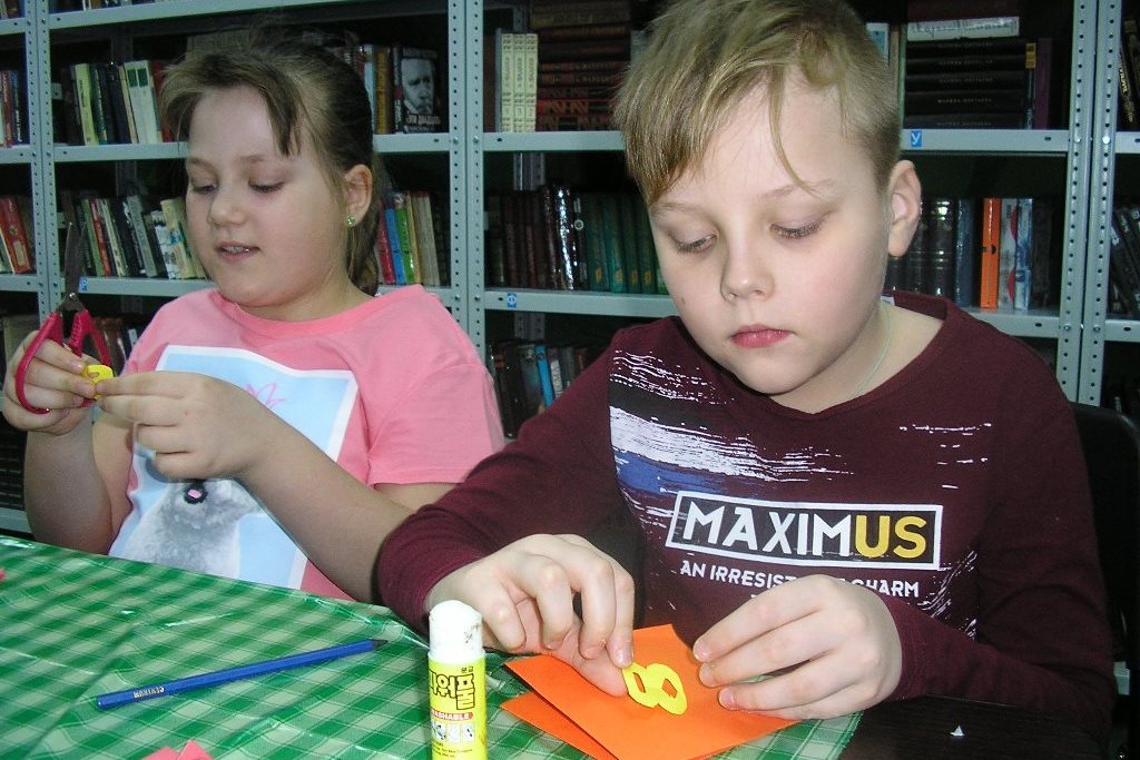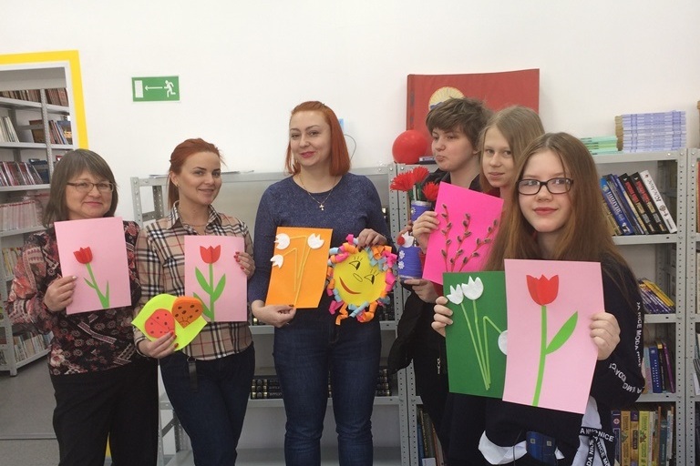 В библиотеке №17 в субботу 29 февраля участники литературно-творческого кружка «Час чтения и творчества» готовили своим мамам поздравительные открытки. Вооружившись библиотечной книгой «Энциклопедия поделок для больших и маленьких» с помощью цветной бумаги, ножниц и карандашей дети старательно и с удовольствием мастерили раскладную открытку, а затем украшали ее объёмными цветами. Слова поздравления находили в книгах «Наши любимые праздник», «Стихи о маме», «Моя любимая мама».