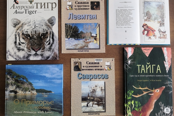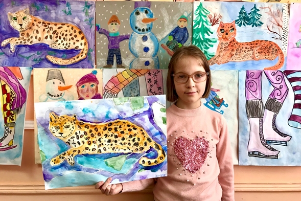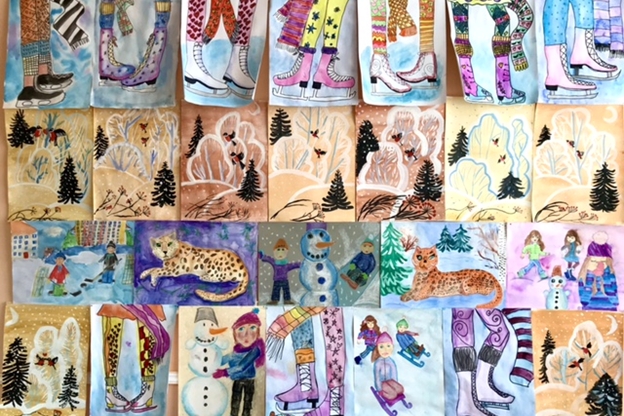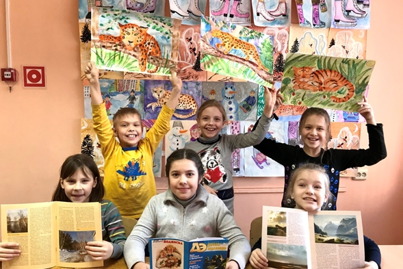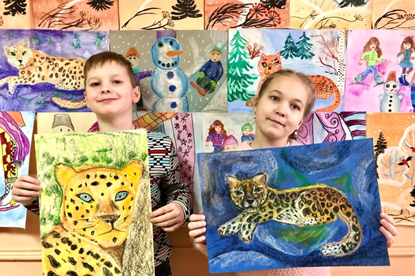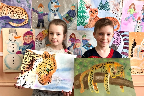 Вместе прочитав библиотечные книги о великих русских пейзажистах А. Саврасове и И. Левитане, юные художники попробовали свои силы и в этом искусстве. Они нарисовали свои зимние пейзажи гуашью на тонированной бумаге. Настя Трофименкова, Маша Пономаренко, Света Фатерина, Аня Деревягина, Саша и Юля Маркины решили изобразить наших приморских лесных кошек: дальневосточного леопарда и уссурийского тигра! Костя Носовской изобразил тигра и тигрицу на прогулке.