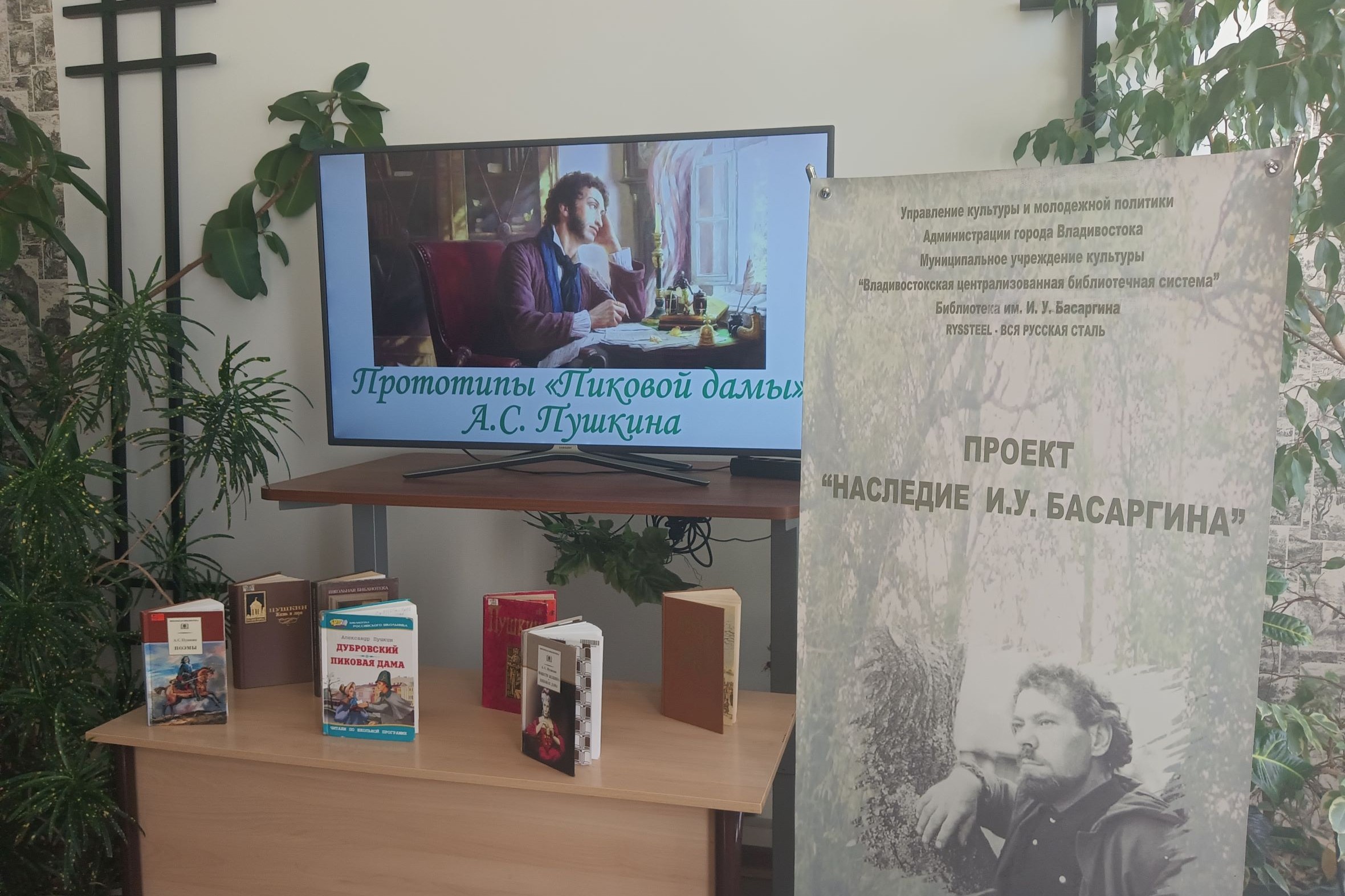 Книжная выставка представлена рассказами, повестями Пушкина и иллюстрациями известных художников: А. Бенуа, А. Костина, Н. Кузьмина. На одном из портретов фрейлина екатерининского двора Н.П. Голицына – это и есть прототип Пиковой дамы. Учащиеся зачитывают фрагменты из текста повести, что позволяет узнать эту личность со всеми её странностями, противоречиями, любовью ко всему загадочному. Постепенно становится понятно, почему А.С. Пушкин не мог пройти мимо этого загадочного сюжета, ведь он и сам восклицал: «Ах, обмануть меня не сложно, я сам обманываться рад». В заключение делаем вывод, что пушкинские сюжеты «работают» в реальной жизни до сих пор. Оказывается, в особняке, где жила фрейлина Голицына в Петербурге (1-я Морская, 10) ныне находится не что-нибудь, а казино, таким образом литературный круг замыкается.