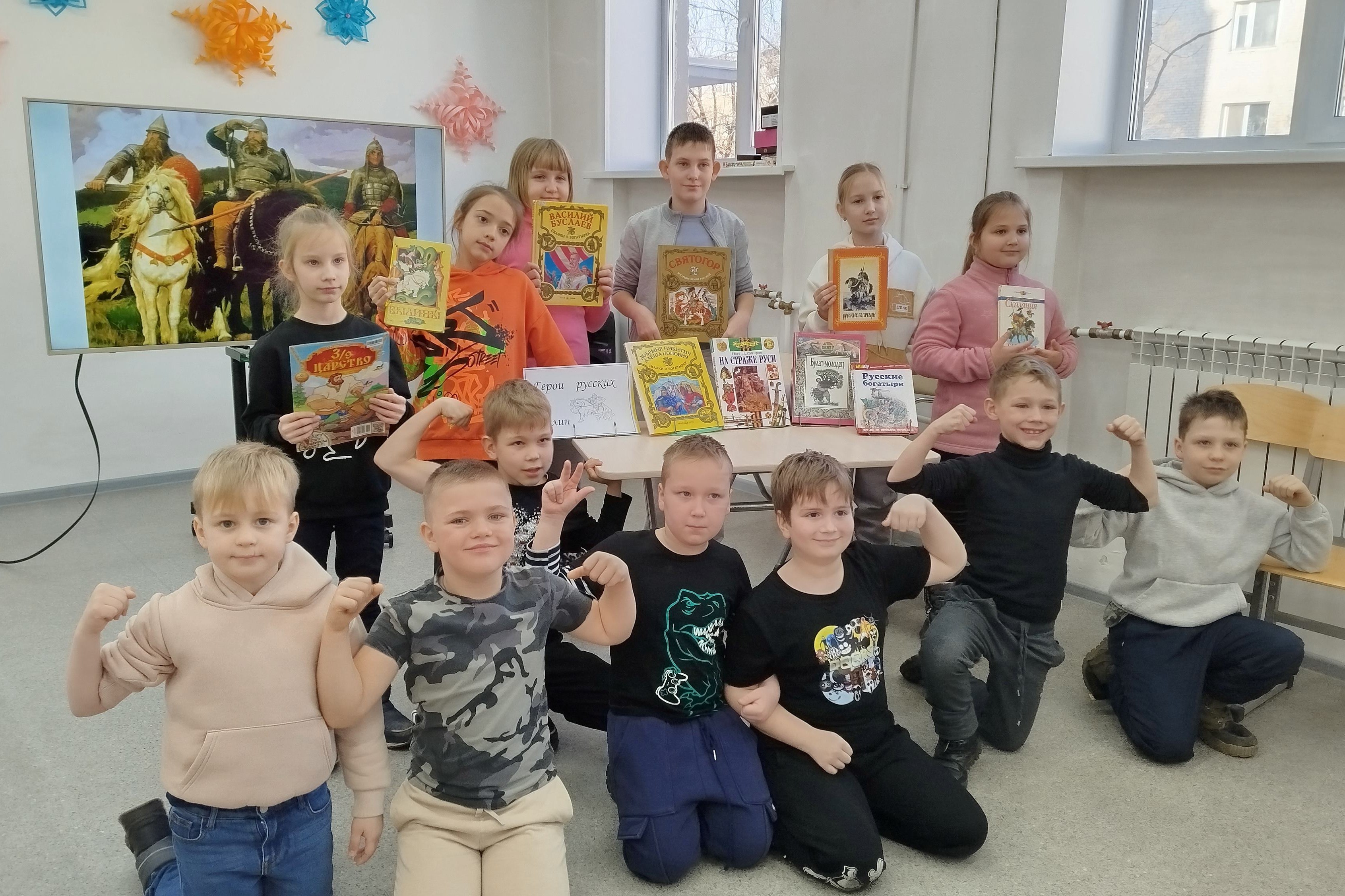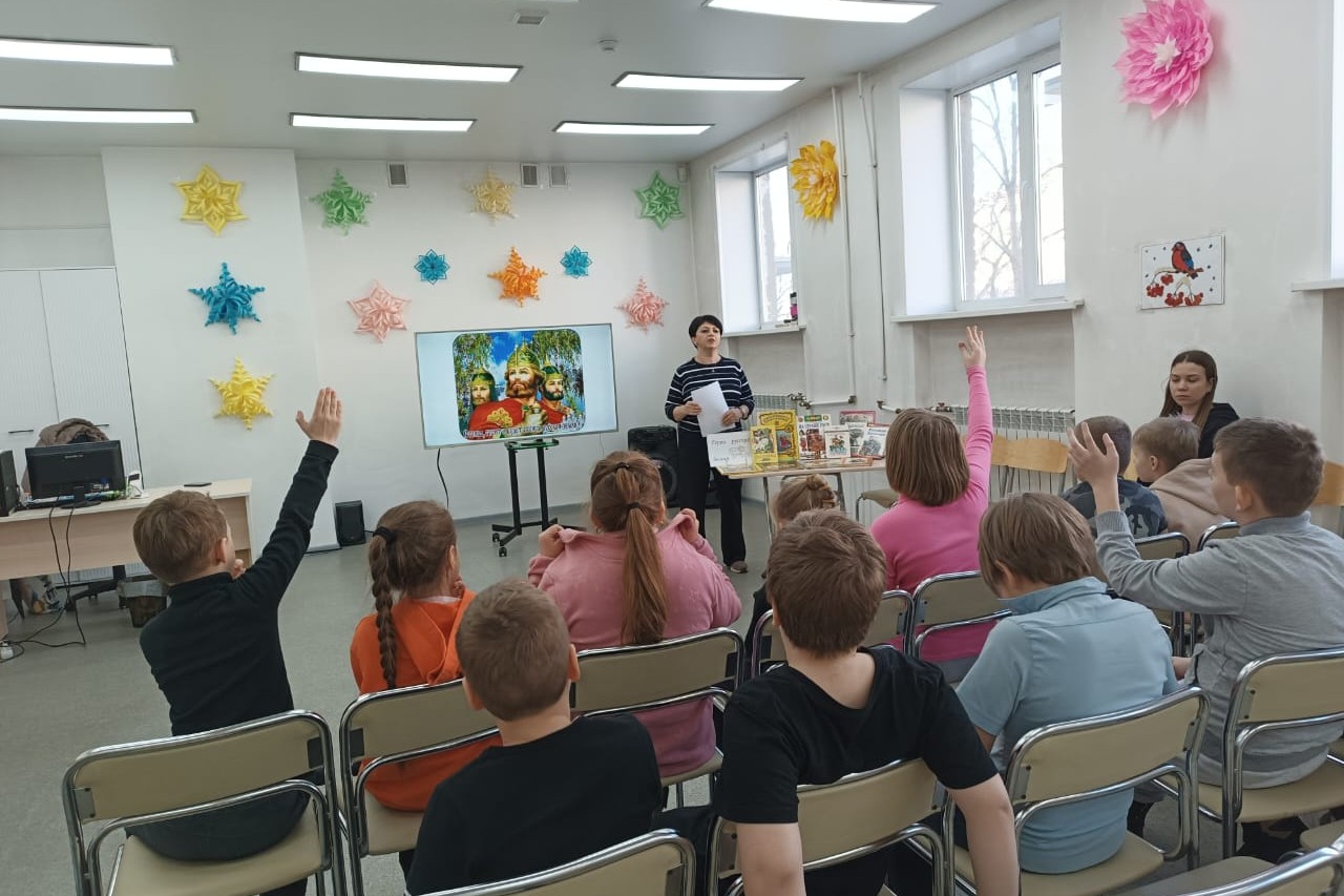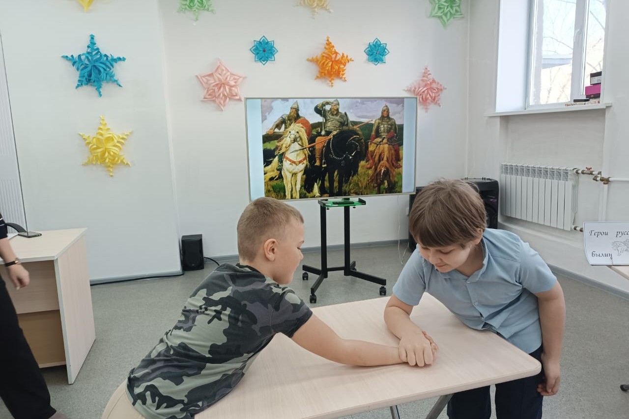 Дети без труда назвали имена самых известных богатырей – Илья Муромца, Добрыню Никитича и Алёшу Поповича. Из книги «Русские богатыри» школьникам прочитали былину о первом бое Ильи Муромца и героическую сказку «Никита Кожемяка», где богатыри показаны как мудрые, сильные и могучие воины, которые приходили на помощь своему народу в самых трудных ситуациях.