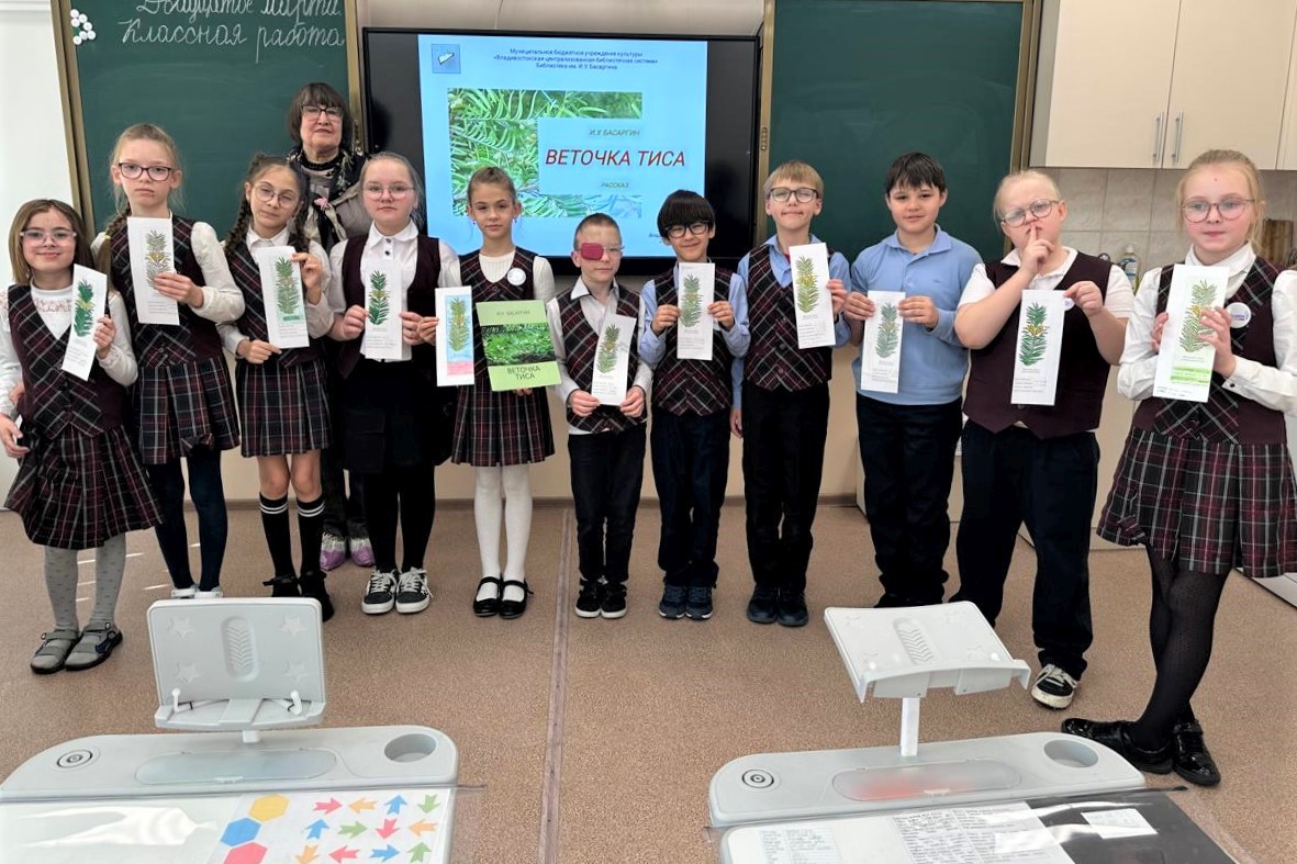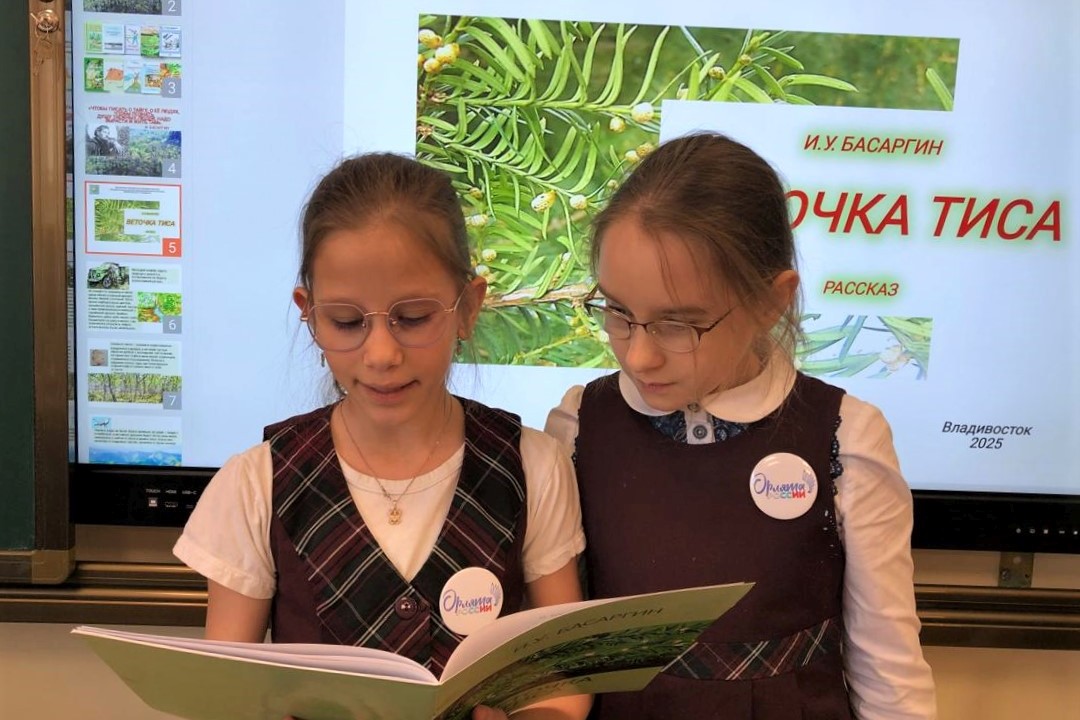 В дни Всероссийской недели детской книги в третьем и четвертом классах КГОБУ Владивостокская КШ-сад IV вида состоялись занятия, на которых школьники познакомились с недавно изданной библиотекой книгой «Веточка тиса», включающей не только рассказ И.У. Басаргина, но и занимательные задания, разработанные учителями русского языка, литературы и биологии Кавалеровской МБОУ «СОШ № 3».