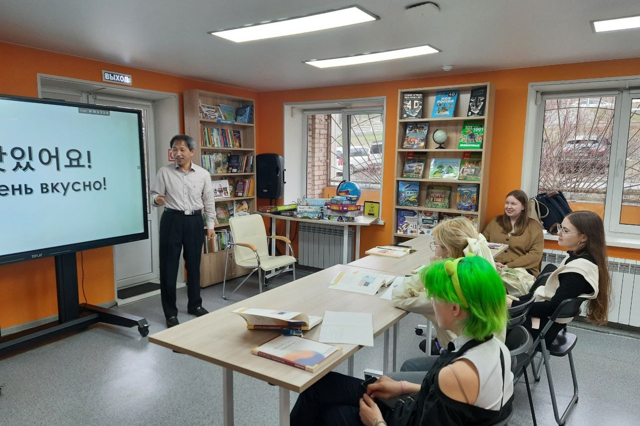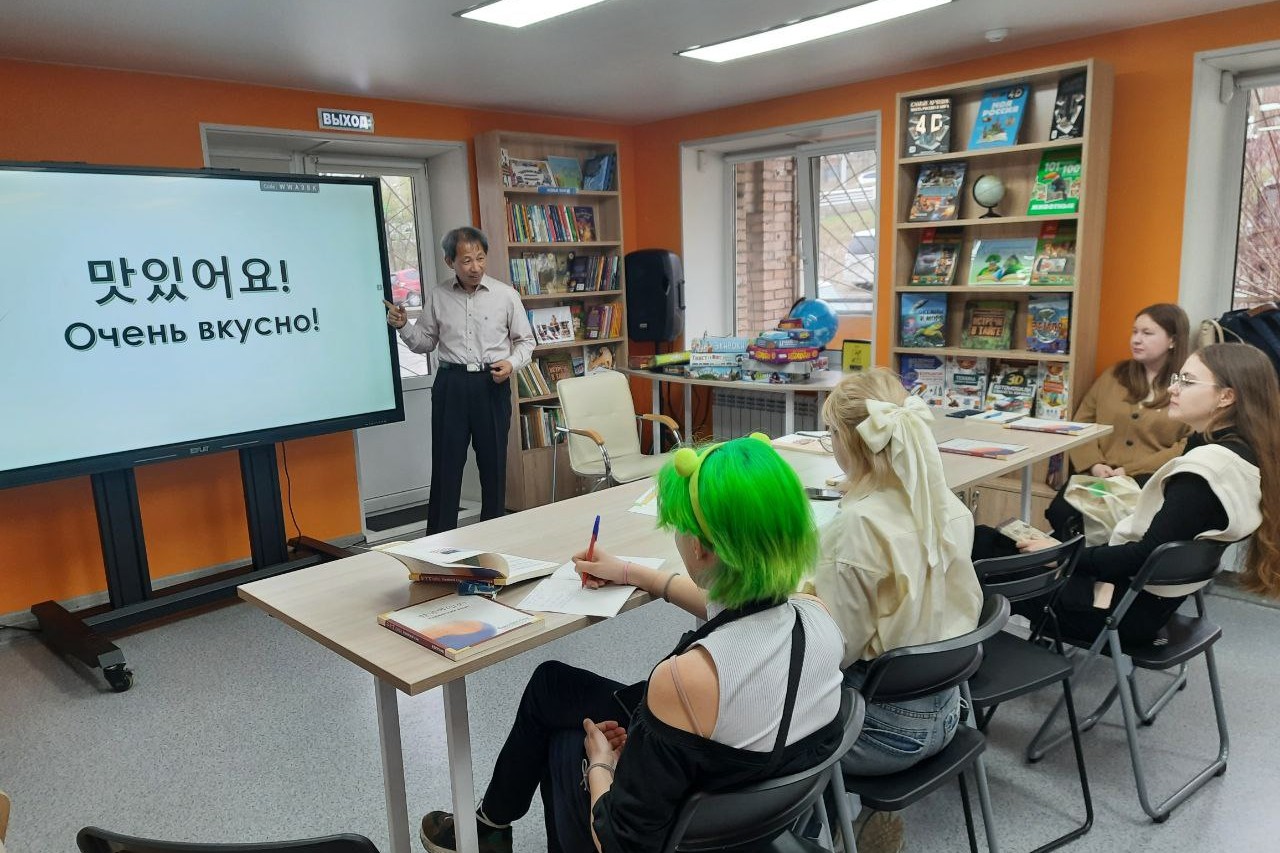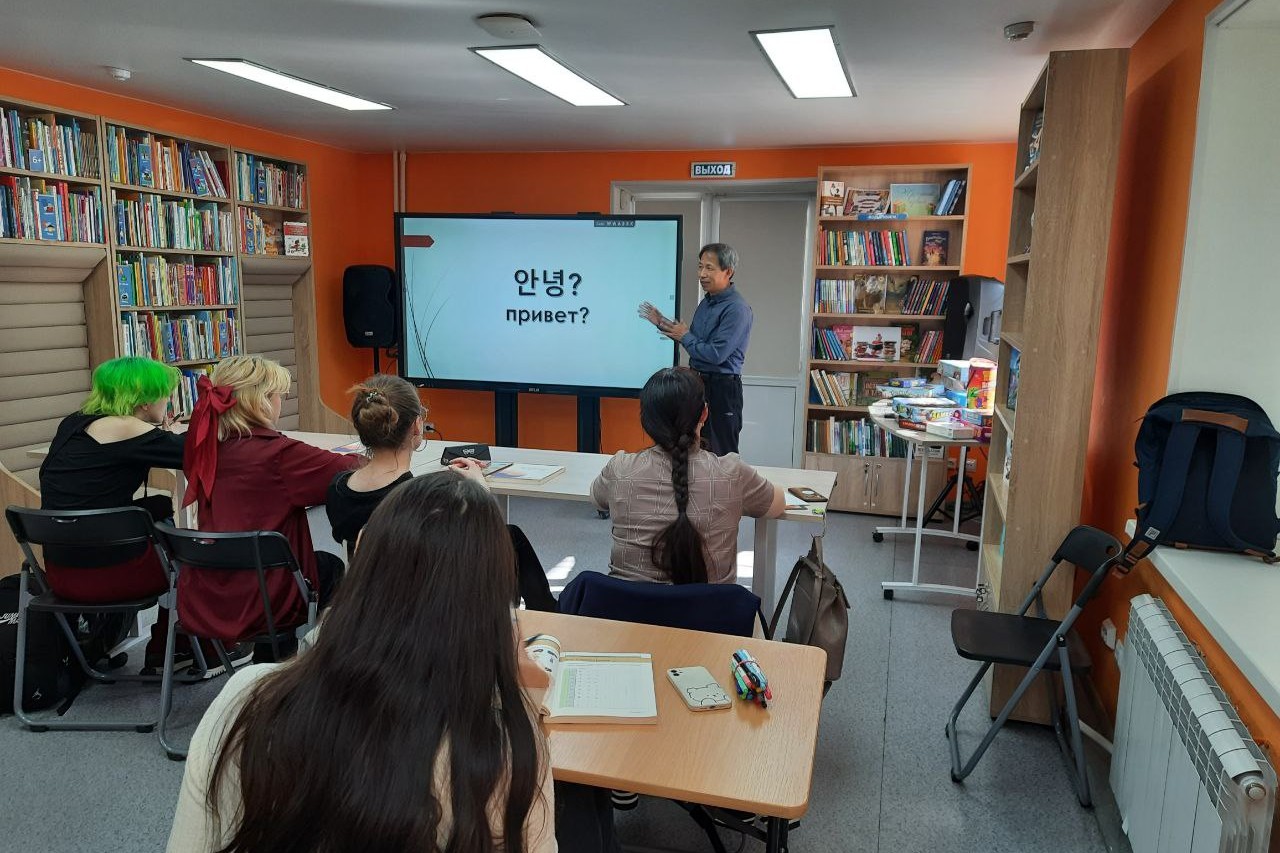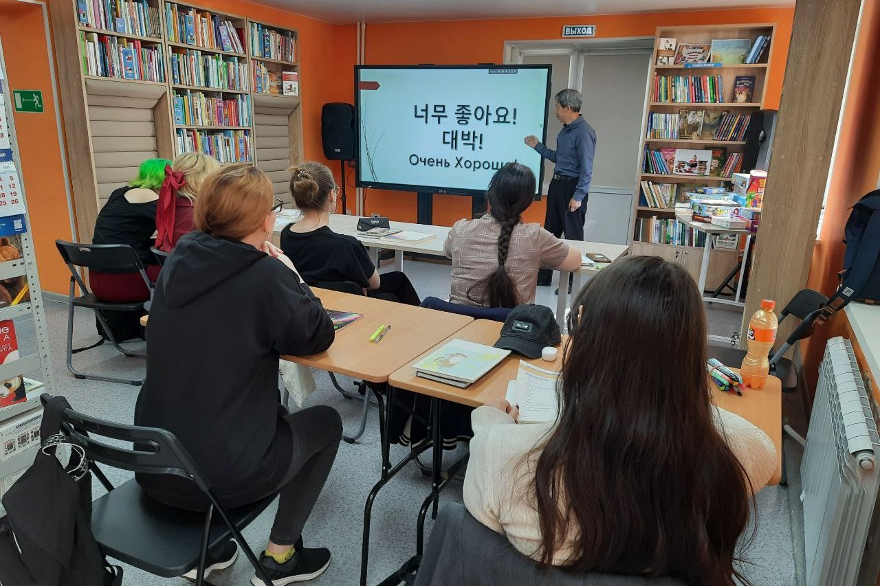 30 апреля библиотеке состоялось занятие по изучению корейского языка. На корейском языке говорят более 80 млн человек. Корейский является одним из древнейших мировых языков, он самобытен и оригинален, отражает многовековые традиции корейского народа и национальный характер. Сегодня интерес к корейскому языку стремительно растёт и практически не уступает интересу к китайскому языку. Это объясняется рядом причин, таких как интерес к культуре Кореи – а это кинематограф, музыка, традиции, путешествия. Корейский язык преподает носитель языка Ким Бонч Чел. На очередной встрече присутствовали и познавали тонкости языка как студенты, так и домохозяйки и служащие — все, кто интересуется корейским языком или запланировал путешествие в Корею и хочет чувствовать себя комфортно в поездке.