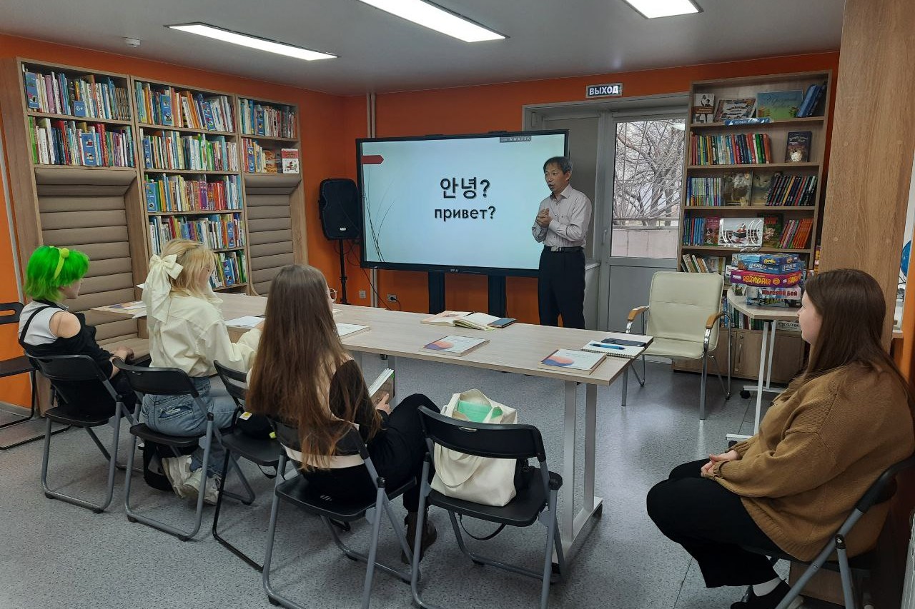 30 апреля библиотеке состоялось занятие по изучению корейского языка. На корейском языке говорят более 80 млн человек. Корейский является одним из древнейших мировых языков, он самобытен и оригинален, отражает многовековые традиции корейского народа и национальный характер. Сегодня интерес к корейскому языку стремительно растёт и практически не уступает интересу к китайскому языку. Это объясняется рядом причин, таких как интерес к культуре Кореи – а это кинематограф, музыка, традиции, путешествия. Корейский язык преподает носитель языка Ким Бонч Чел. На очередной встрече присутствовали и познавали тонкости языка как студенты, так и домохозяйки и служащие — все, кто интересуется корейским языком или запланировал путешествие в Корею и хочет чувствовать себя комфортно в поездке.