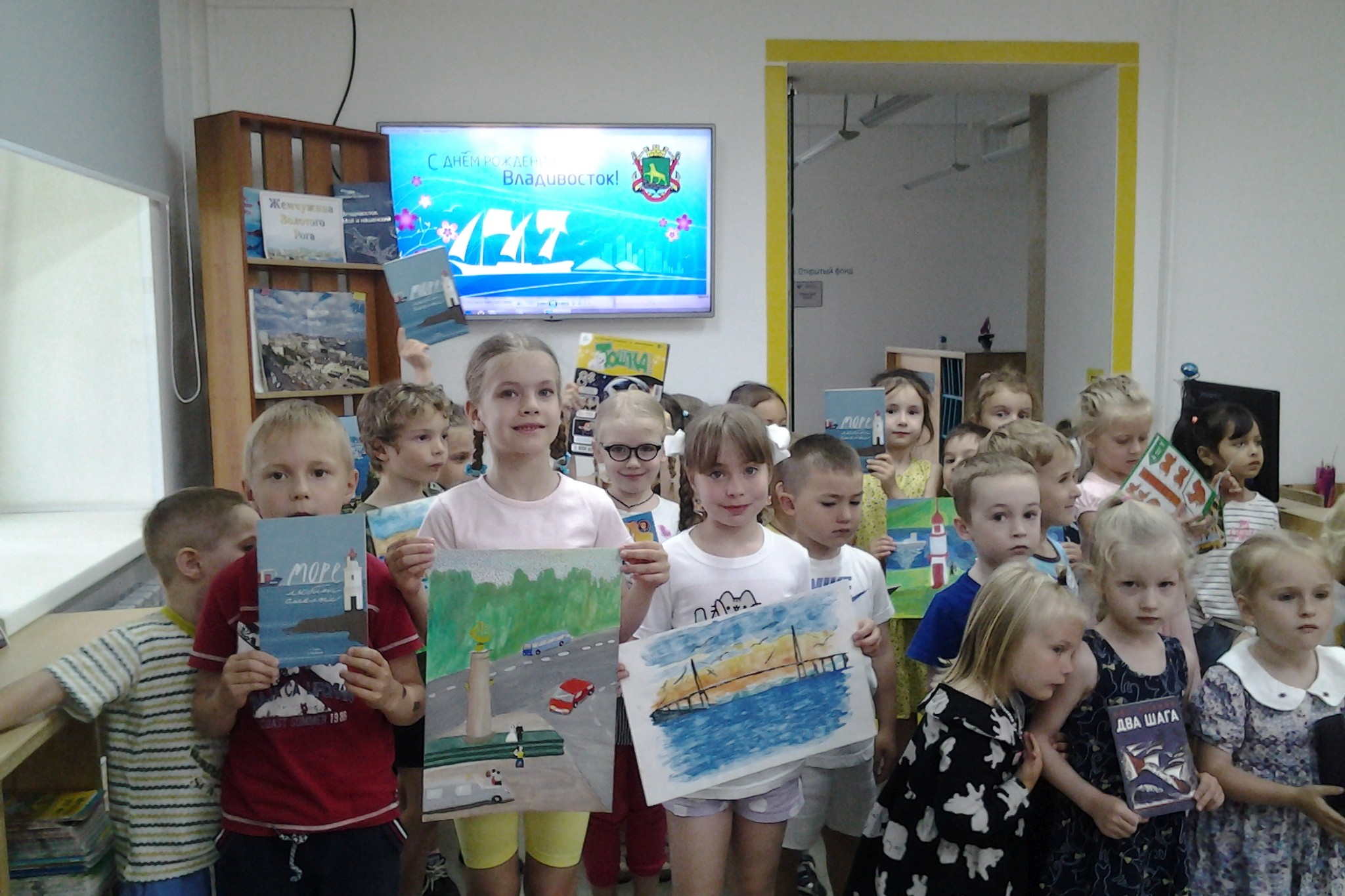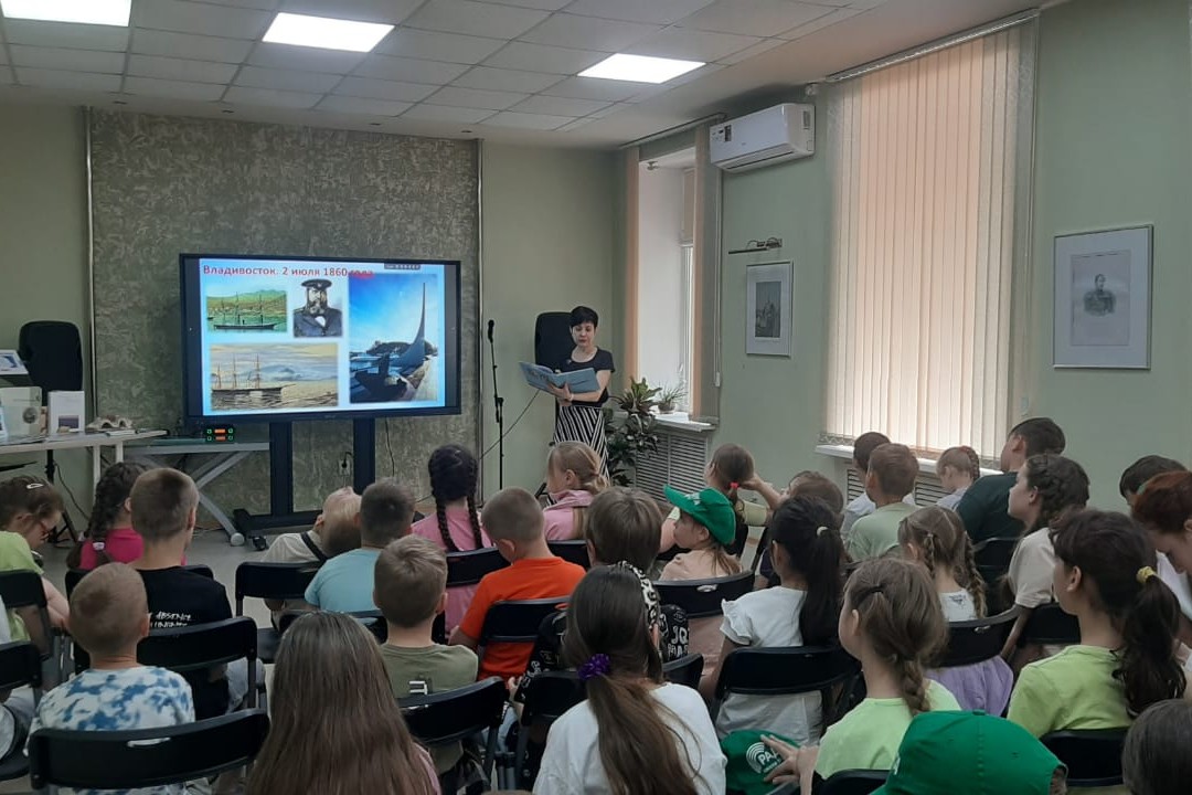 2 июля краеведческий час «Город у моря», посвященный дню рождения Владивостока, состоялся в библиотеке им. Н.Н. Муравьева-Амурского. Участники летнего оздоровительного лагеря СОШ № 62 совершили заочное путешествие по достопримечательностям города – побывали на фортах Владивостокской крепости и на Корабельной набережной, увидели маяки и мосты, посетили Приморский океанариум и произвели подсчет тигров во Владивостоке, полюбовались городом с верхней площадки самого редкого вида транспорта – фуникулера. Путешествие по городу сопровождалось чтением стихотворений Елены Муковозовой из книги «Город у моря», рассматриванием фотографий из альбомов «Посмотри на Владивосток», чтением книги Алексея Кротова и и Натальи Плотниковой «Азбука Владивостока». Рассказ о городе был бы не полным без воспоминания о отце-основателе Владивостока – генерал-губернаторе Восточной Сибири Н.Н. Муравьеве-Амурском и первопоселенцах города — 28 матросах под командованием прапорщика Комарова.
