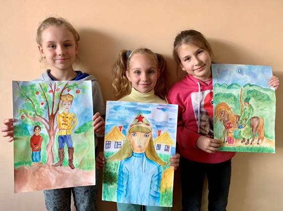 Провожает отца на фронт Мальчиш на рисунке Тихомировой Кристины, большой портрет Мальчиша-Кибальчиша получился у Кулинченко Полины, а Мальчиш Кузнецовой Иры принёс красногвардейцу ковшик воды.