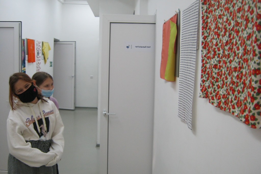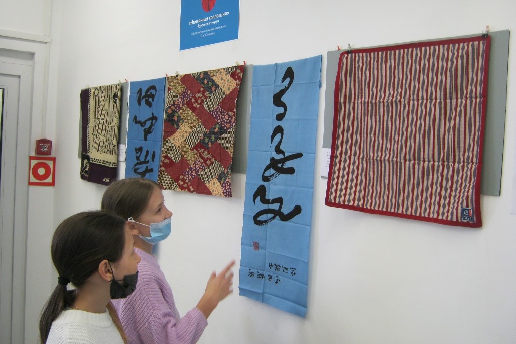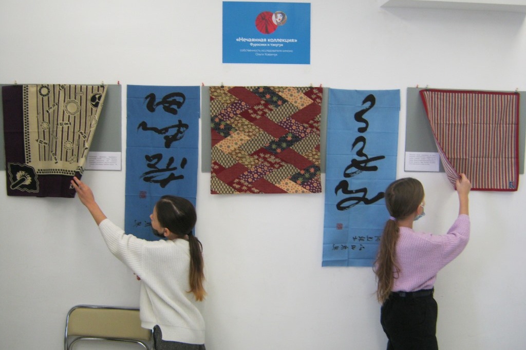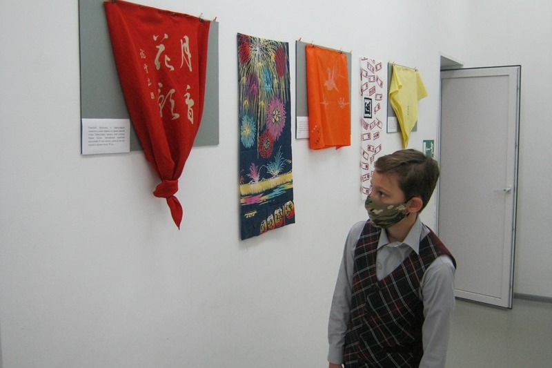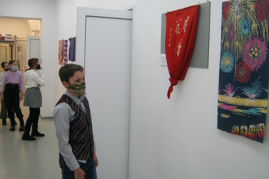 26 января младшие воспитанники Центра развития творчества детства и юношества посетили галерею библиотеки №8. Сейчас в ней выставляется «Нечаянная коллекция» фуросики и тэнугуи Ольги Хованчук. Фуросики — это японский платок для упаковки, тэнугуи — что-то навроде полотенца. На первый взгляд на стенах просто висят прямоугольники и квадраты цветной ткани, но за каждым из них очень личное воспоминание хозяйки вещей. Кем подарен, из какой ткани сделан, мужской или женский — маленькие пояснения можно прочитать у каждого фуросики. Детвора на выставке в первую очередь потянулась к самым ярким экспонатам: фиолетовому с розовыми автобусами, оранжевому с голубыми журавликами. Всеобщая симпатия досталась синему тэнугуи с разноцветными салютами. Но и про весь текстиль на выставке точно можно сказать — великолепное чувство цвета, эстетическое наслаждение. Не обошли вниманием дети и сказки из предложенной в дополнение к «Нечаянной коллекции» выставки книг «Дух Японии на страницах».