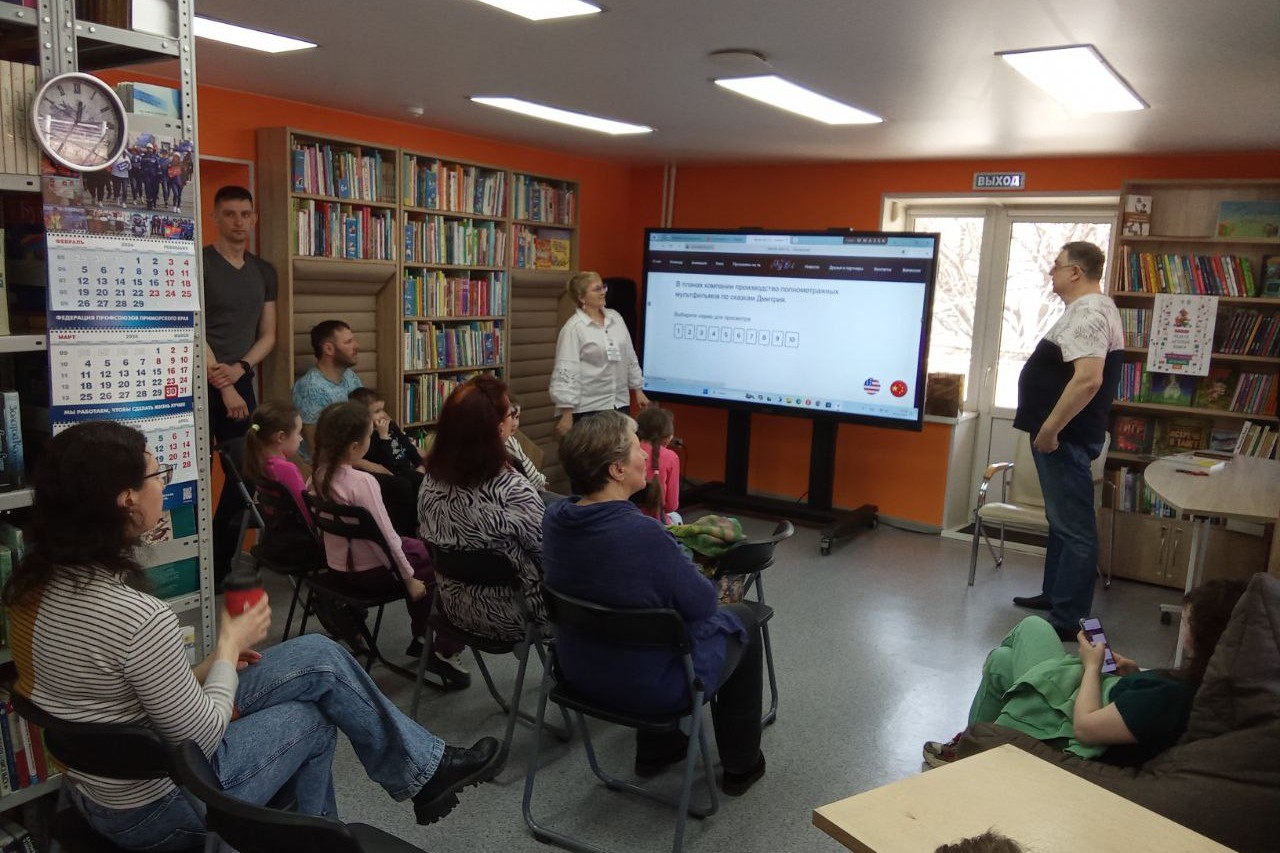 30 марта в рамках Недели детской книги «Читает семья, читает страна» состоялось заключительное мероприятие. Встреча в Библиотеке на Заре была по-семейному теплой и дружной. В гостях у читателей и участников мультстудии был писатель, член Гильдии драматургов России, исполнительный продюсер кинокомпании «МуВи энд Ко» (https://movieandco.ru/) Дмитрий Виноградов.
