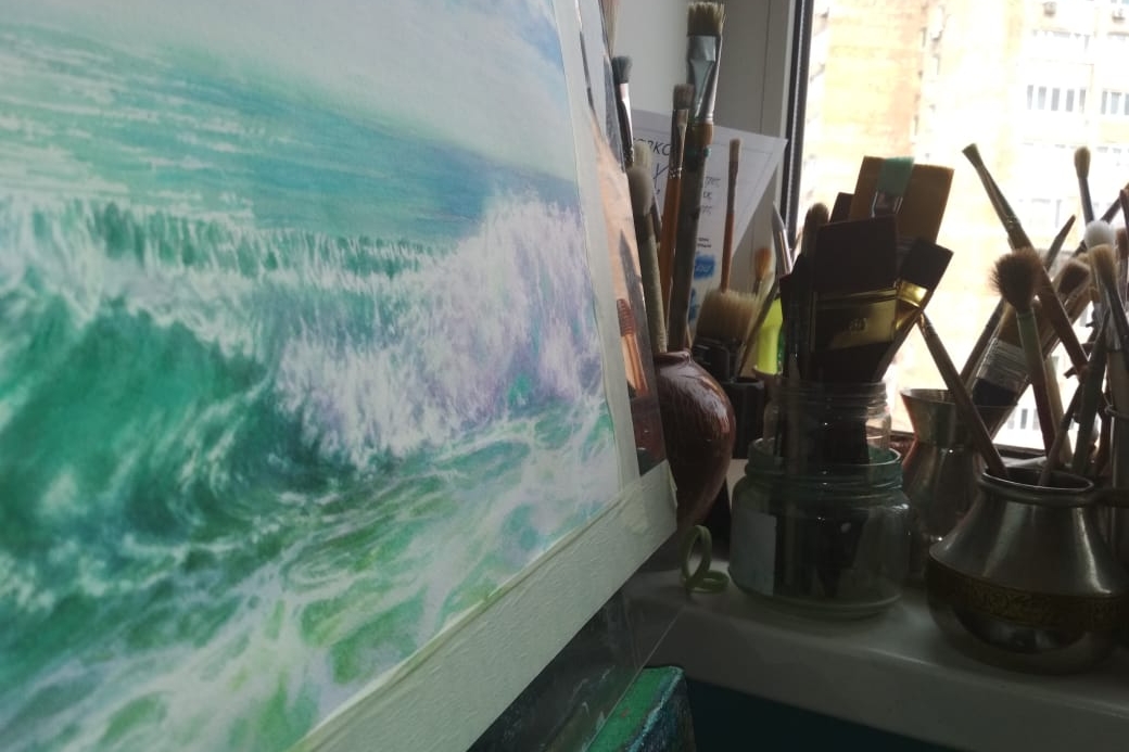 Через много лет, перепробовав разные техники для изображения моря – остановился на акварели. Именно она, своей сложностью и своенравным характером максимально подходила под характер моря.